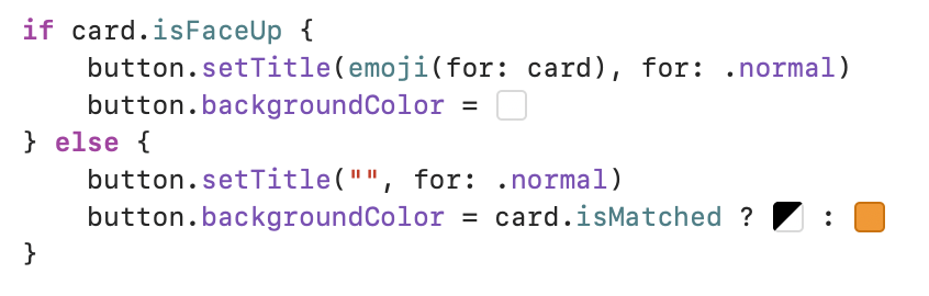 So, we grab a card button and a card from the respective arrays and then, if the cart is face-up we set its title via a method we are going to write soon called emoji(for: card) and leave the background colour to white. If it is not face-up we will set the title to an empty string and the background colour to the result of a ternary conditional operator with the same Color Literal (which in Xcode 11 beta 2 was a bit buggy in my experience) but with alpha: 0.