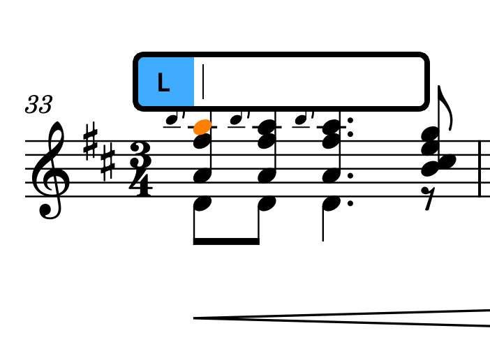 Come potete vedere, la figura mostra una L, ovvero, left-hand fingering (diteggiatura per mano sinistra). Premendo freccia in giù la L diventerà un R e vi permetterà di scrivere per la mano destra. Curiosamente, ma non mi sorprende, premere di nuovo freccia in giù non compie nessuna operazione (cosa che per me sarebbe stata ciclicamente logica) ma occorrerà premere freccia in su per tornare al punto di partenza.