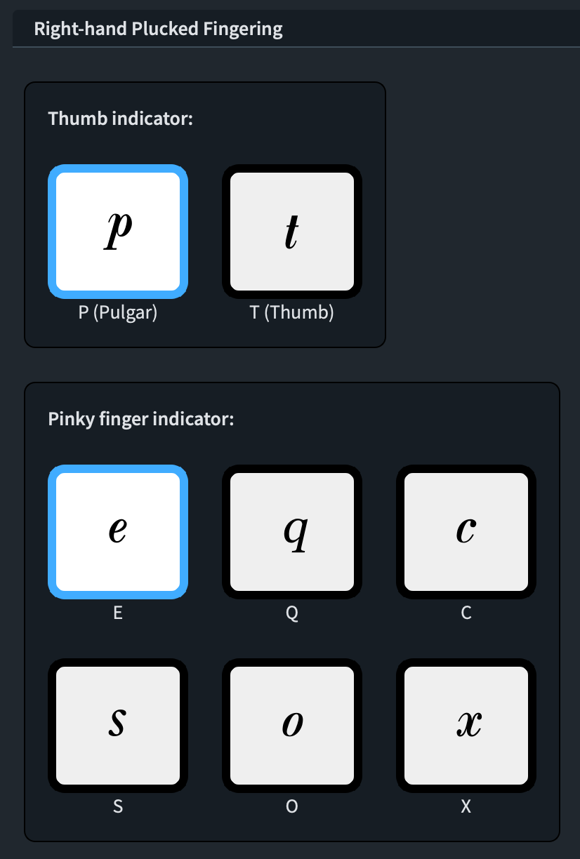 Le opzioni per determinare quali lettere debbano essere usate per il pollice e per ogni altro dito della mano destra si trovano nella pagina Fingering delle Engraving Options, nella sezione Design, sotto la sottosezione Right-hand Plucked Fingering. Si può scegliere tra p e t per il pollice e tra sei diverse opzioni per il mignolo (e, c, q, s, o, x).