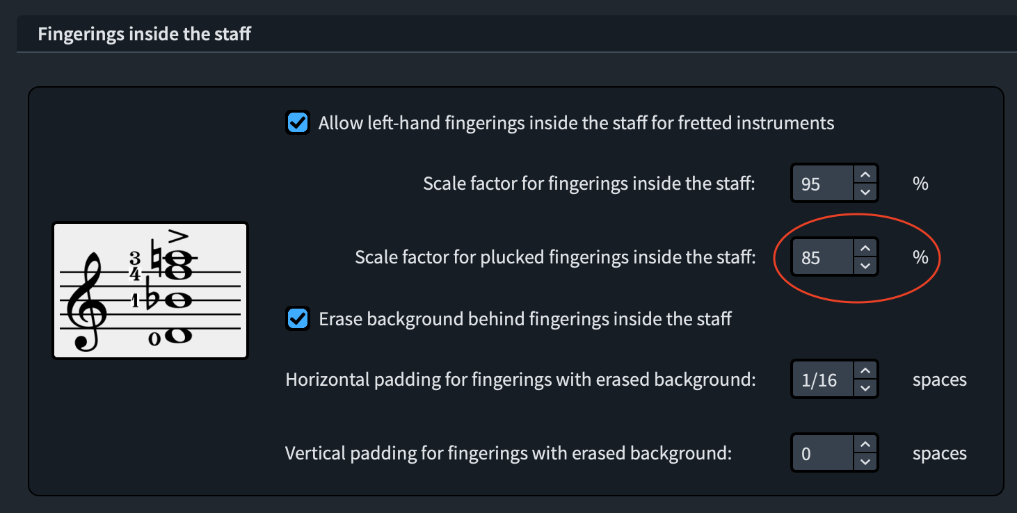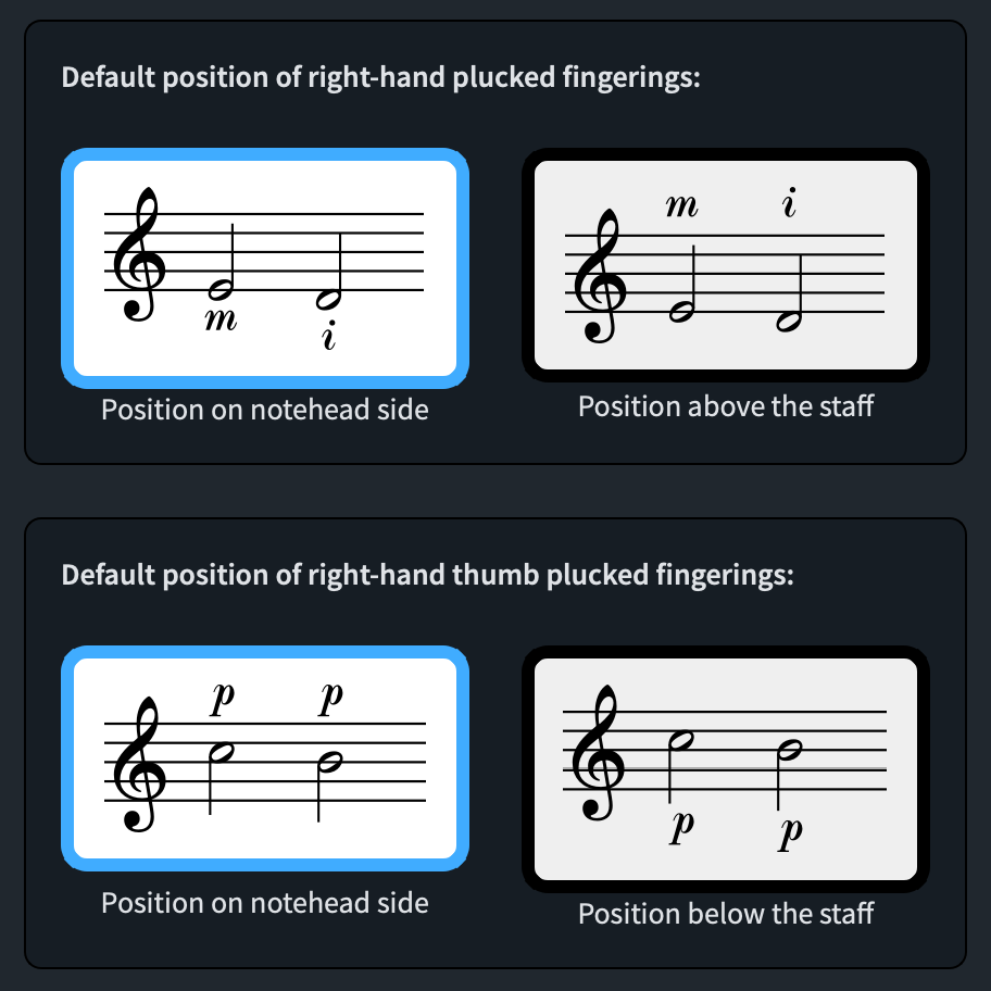 È possibile modificare queste impostazioni di base aprendo le Engraving Options, recandosi nella pagina Fingering alla sezione Position e modificando le seguenti due variabili: Default position of right-hand plucked fingerings e Default position of right-hand thumb plucked fingerings.