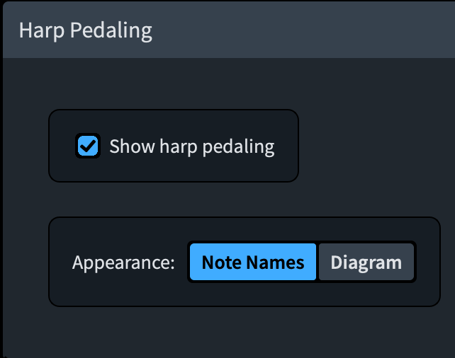 La nuova pagina Harp Pedaling delle Engraving Options fornisce opzioni dettagliate per controllare l’aspetto di entrambe le tipologie di indicazioni. Nello specifico, si può interagire con la dimensione, lo spessore, la lunghezza e la spaziatura delle componenti dei diagrammi, oltre che specificarne la posizione verticale o orizzontale di base.