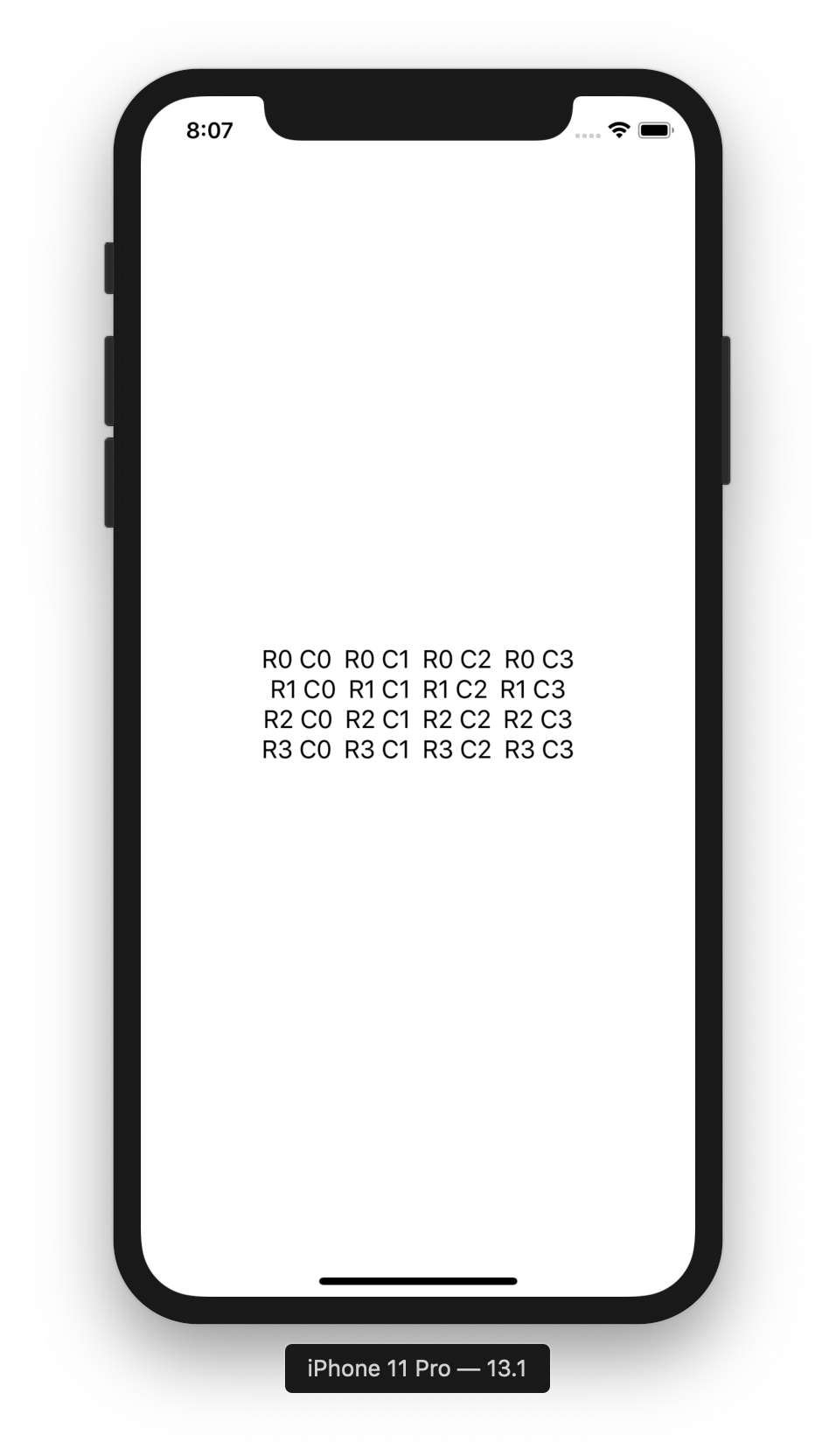 Now switch back to the ContentView file. Inside the body property create an instance of GridStack, passing 4 to both parameters and, in the closure, define row, col as accepted parameters and create the view Text("R\(row) C\(col)"). This creates a quite ugly result but still, the possibilities are endless: