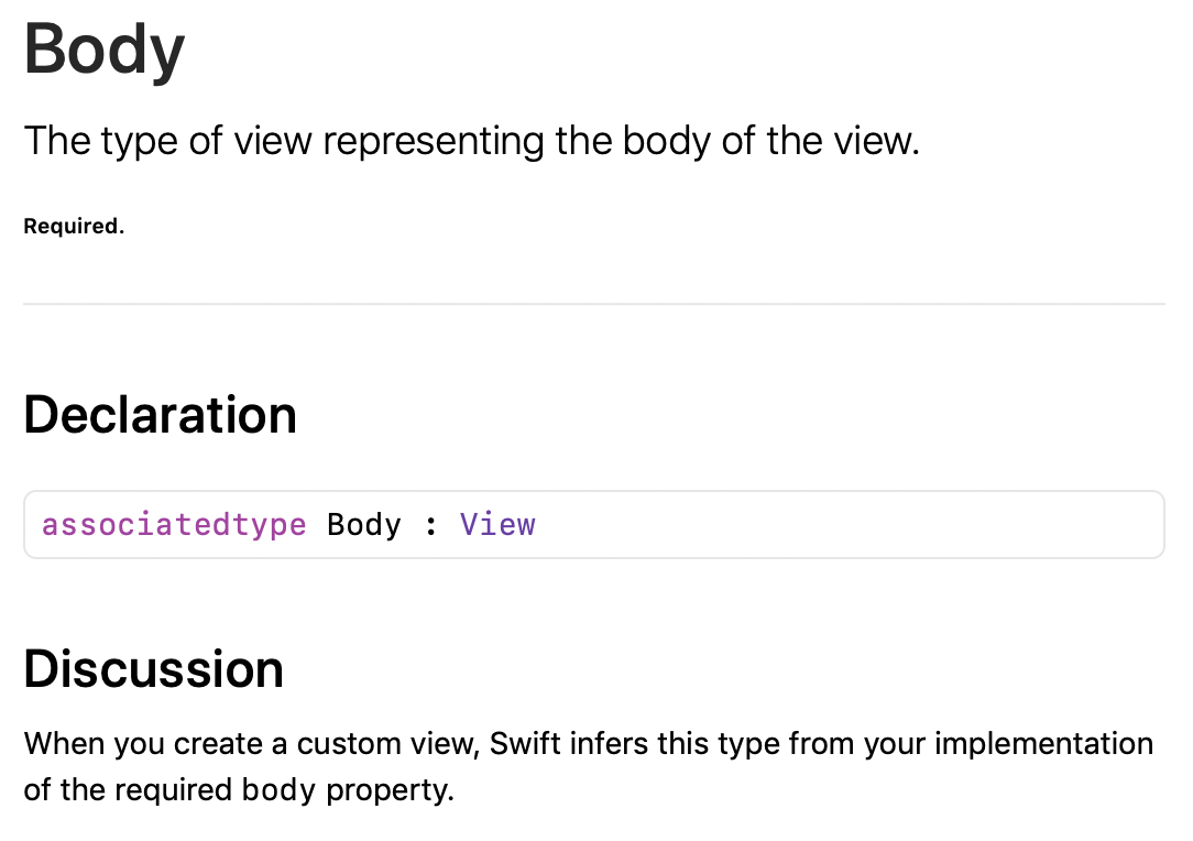 Let’s give a look at the View protocol and at its attached associated type. Scrolling almost down to the end of the description we find this: