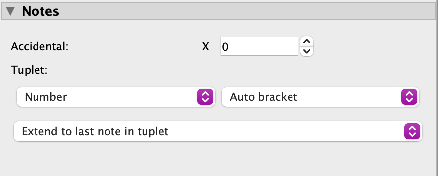 Under Tuplet: you will find three dropdown menus. The first one has four options: “None,” “Number,” “Ratio,” and “Ratio note.” Choosing the first one will simply hide the number, which is precisely what we want in the example above, as there is no need to repeat what is obvious. The second one is the default, and it only shows the number of note making up the tuplet, in our case 3. The third one will show a ratio between the number of notes composing the tuplet and the number of notes of the same duration that would normally fit in the same space. For example, in the example above, this option would show 3:2 because a triplet is usually made up of 3 notes in the place of 2 of the same value. The last option allows us to be more precise and specify the ratio and the note value, for example 3:2 eight notes. Here is a visual recap.