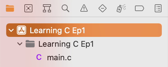 Inside the “Learning C Ep1” group we have a single file called main.c. The .c file extension tells us that it is a file using the C language while the main name is a requirement for all C files as the compiler will run every instruction you throw at it only if it is inside the main function, which we will look at shortly.