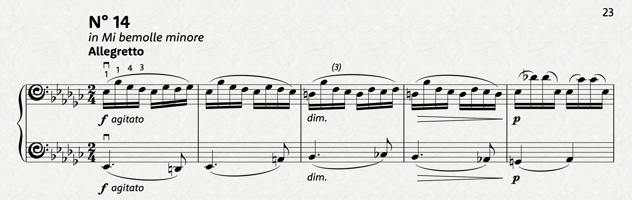 From the picture above, you can see how a fingering is set in italics and enclosed in parentheses. This is because the edition I have been using for this contained a lot of pencil marks, possibly by some owners of that copy. I considered at least interesting to add them in a different typeface, to make the edition more appealing.