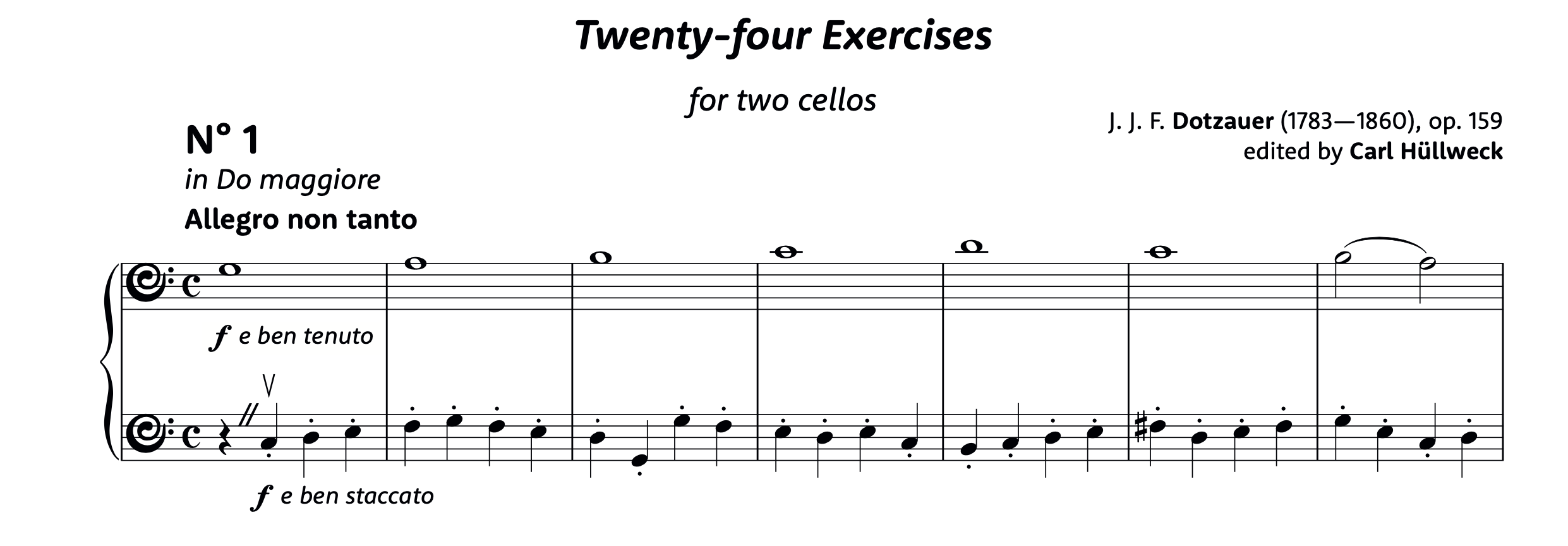 The first edition is a book containing the whole op. 159 and published by Breitkopf & Härtel in Leipzig, Germany, and bearing plate no. 1349 (from which I could find the approximate publishing date). This book is part of a bigger collection compiled by Carl Hüllweck (1852–1910) called: “Studienwerke für zwei Violoncelle von J. J. F. Dotzauer. Neue Ausgabe. Mit allen, für Unterricht und praktischen Gebrauch erforderlichen Bezeichnungen versehen von Carl Hüllweck” (Study works for two cellos by J. J. F. Dotzauer. New edition. Provided with all designations necessary for teaching and practical use by Carl Hüllweck”). My copy comes with a pencil marking “(ca. 1910)” under the “V.A.1349” plate number on the cover, and with a stamp from the Musikaltenhandlung und Antiquariat (Musical history and antiquarian bookshop) department from the C. Peters publishing company in Munich, Germany. This book is the fifth and last of the collection curated by Mr. Hüllweck, and the marking “New edition” clearly states that an earlier one have existed at some point. Being Op. 159 one of the latest creations by Dotzauer, we can expect the first edition to have surfaced in the 1850s, and it is more than possible that Breitkopf & Härtel could have been the first publisher. There was actually another edition, published by Augener & Co. and present in the 1855 entry of the Catalogue of the Universal Circulating Musical Library, and cross-referenced in the 1861 Augener Catalogue. A few issues arose then: Augener & Co. no longer exists to the present day, and most of its earliest catalogue looks lost. As a company, it was founded by Georg Augener (1830–1915) in London, in 1855, making this new work by Dotzauer one of the first entries in their catalogue. At their founder’s retirement in 1910 they were acquired by Schott and Co., Ltd., a subsidiary of the music publishing group Schott, who then had to relinquish it after World War II, in 1962, selling it to Galaxy Music of New York. A mere ten years later, they were once more sold to Stainer & Bell, who is still, to this day, the owner of Augener’s catalogue. I was able to contact Stainer & Bell about this, but they could not find it among their archives. In short, the only complete surviving edition of op. 159 is the one curated by Mr. Hüllweck, and that has been the basis for the full score version. The copy I used is also enriched by several pencil markings, which I can only assume were added by a cello professor in the Munich area sometime between 1910 and when the copy was acquired by the Munich musical library. I decided to add them as well to my edition, as generally, they are appropriate additions. To differentiate them from Hüllweck’s annotations, I set the pencil ones in italic weight.
