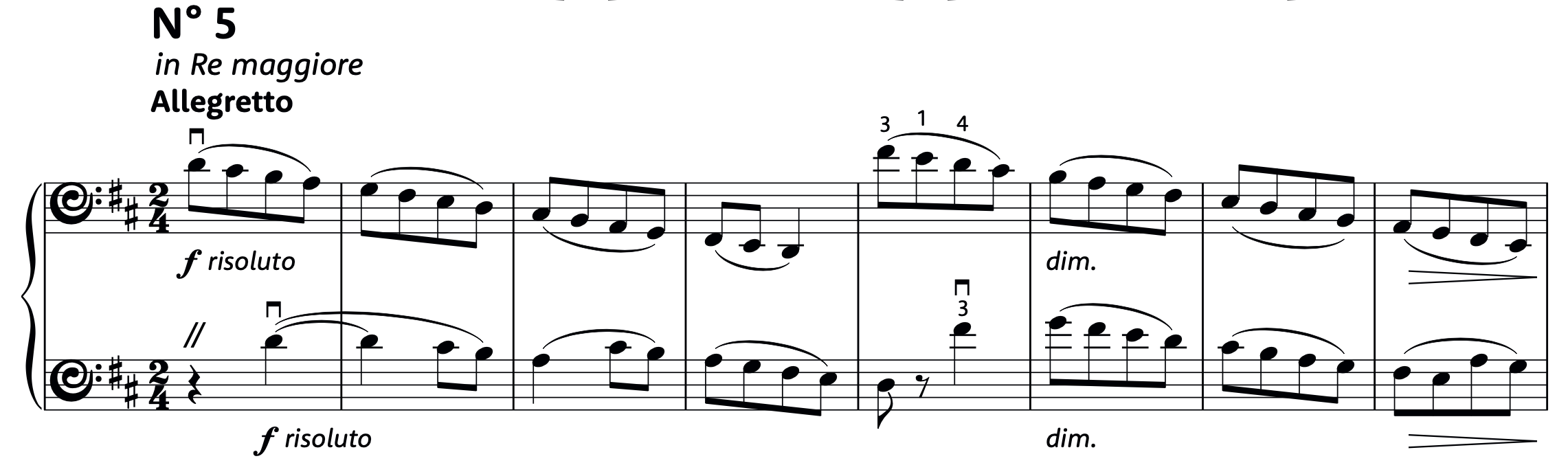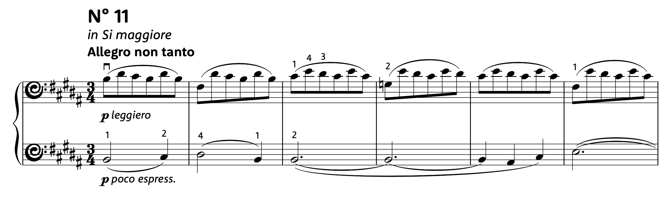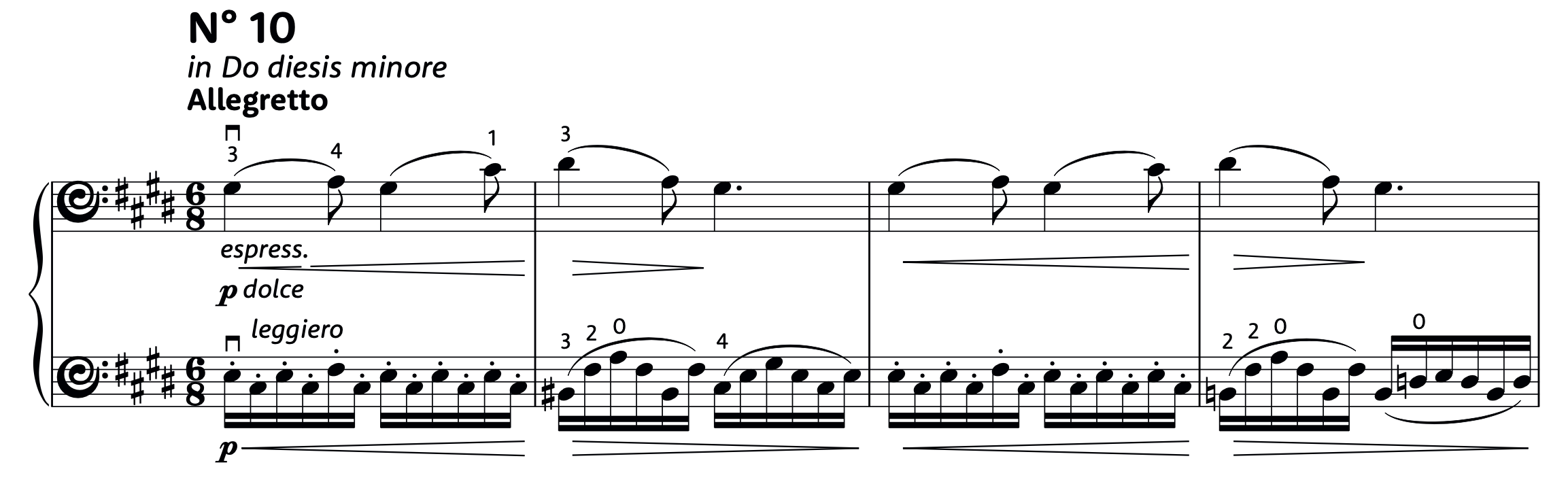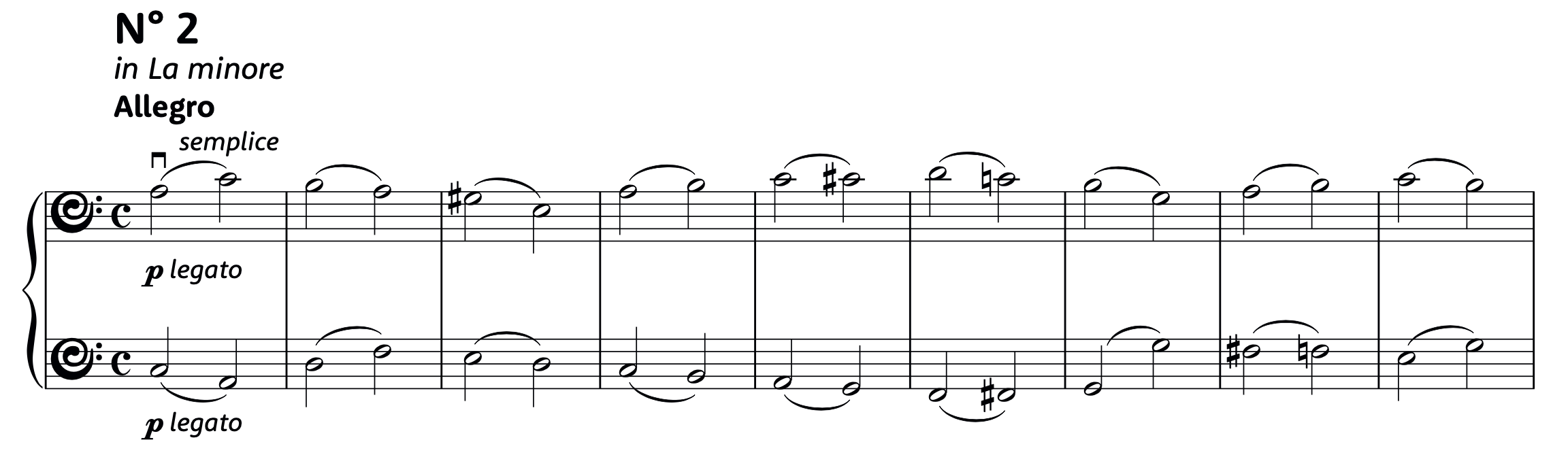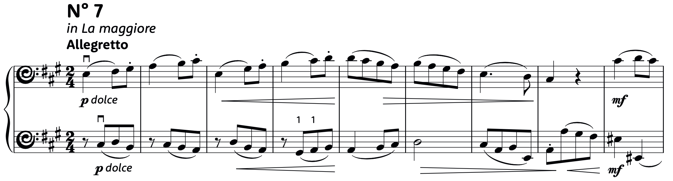 This Allegretto opens the series of rounded binary forms. Part A is a rather simple theme with accompaniment, where roles are clear and defined. Part B, in D major, instead, sees one part running after the other trying to catch it, in a funny, yet challenging, imitative game. The microform of the second part is (B: a-b-b), after which, a “Da Capo al Fine” returns us to Part A. No. 7 is also the first exercise to feature sixteenth notes.