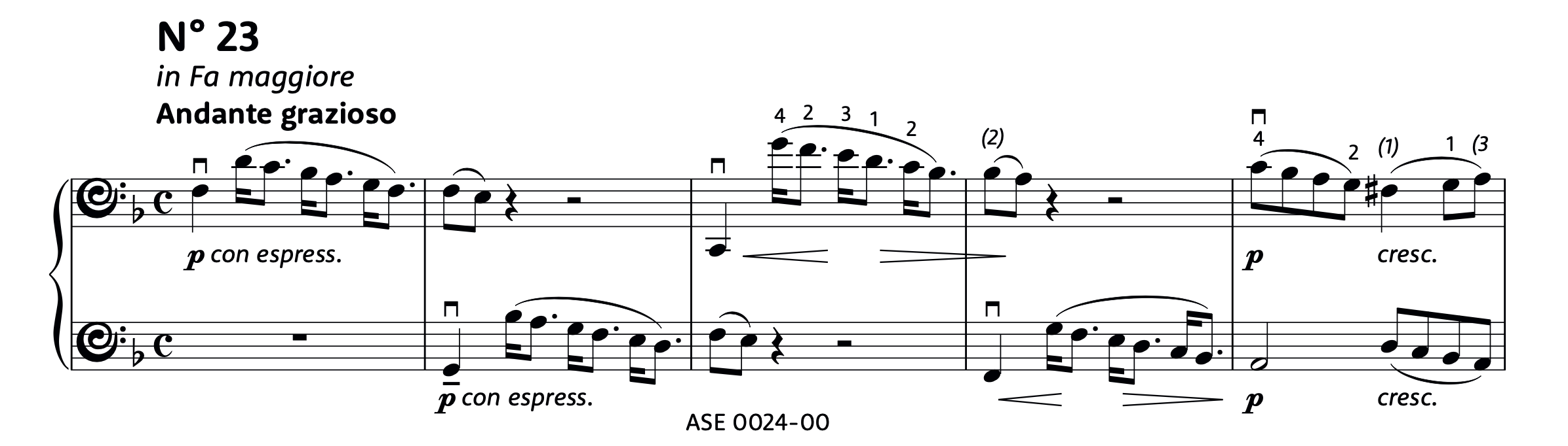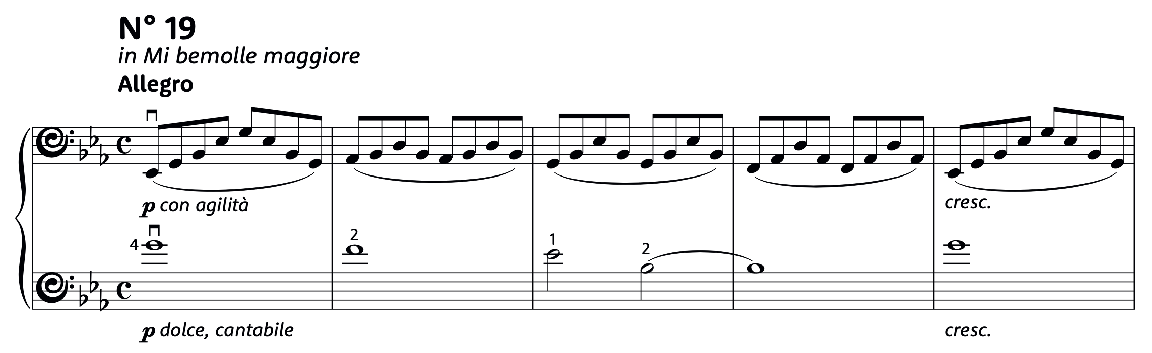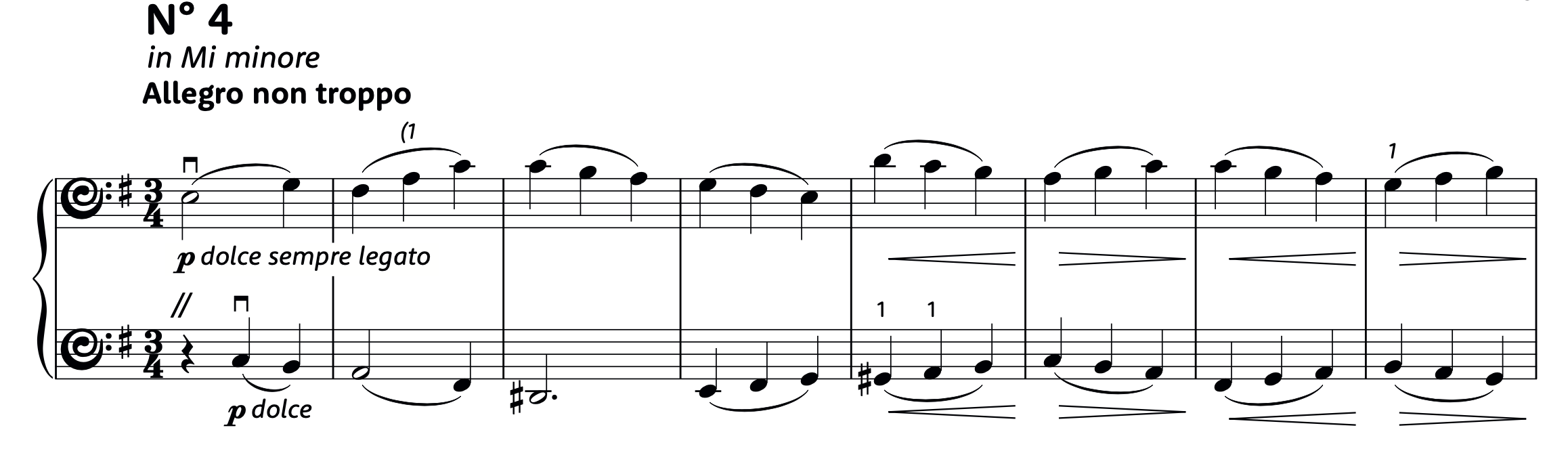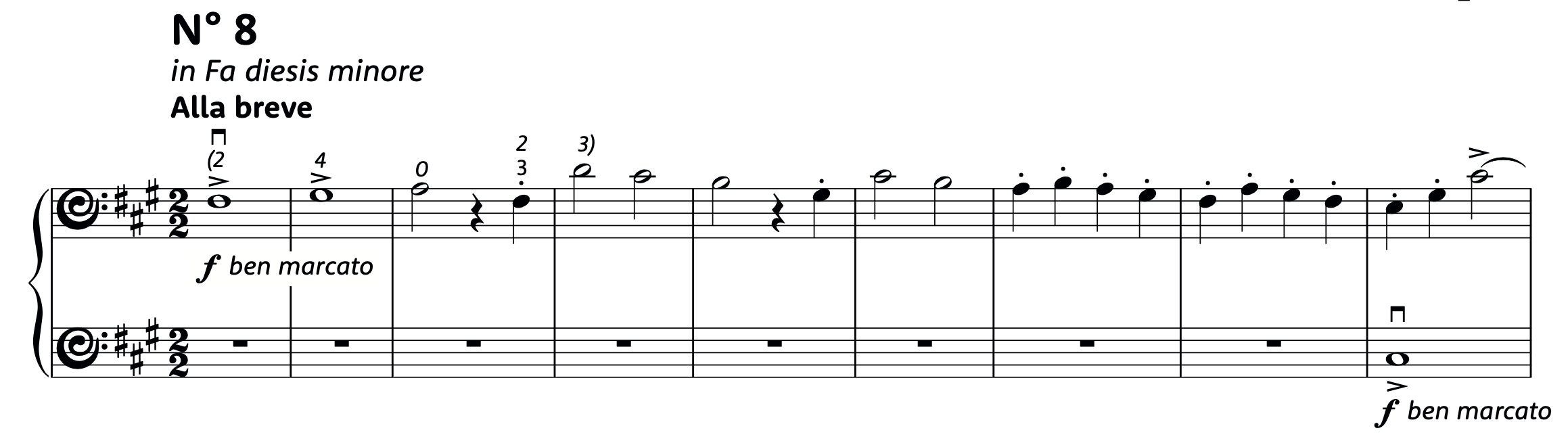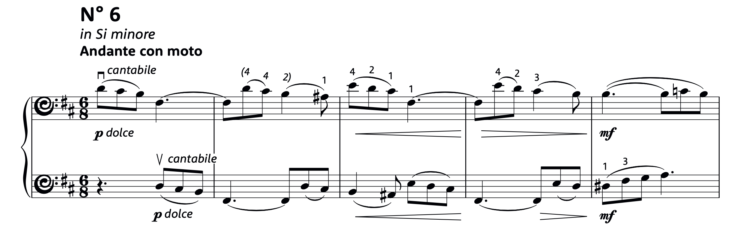 This Allegretto opens the series of rounded binary forms. Part A is a rather simple theme with accompaniment, where roles are clear and defined. Part B, in D major, instead, sees one part running after the other trying to catch it, in a funny, yet challenging, imitative game. The microform of the second part is (B: a-b-b), after which, a “Da Capo al Fine” returns us to Part A. No. 7 is also the first exercise to feature sixteenth notes.