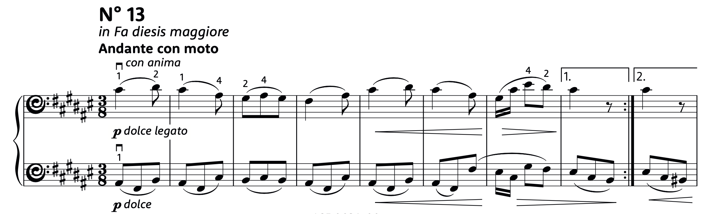 Put one next to the other, No. 7 and this Andantino look like siblings. Their time signature is the same, their melodic contour very similar, their form basically identical (with only part B containing an extra repeat for small section B: a). Once more, the first part is clearly defined with a main voice and an accompaniment one, even if, here, the second cello is vastly more interesting. The second part is an imitation between the two voices, same as it happened in No. 7. Part B is, here, in A major.