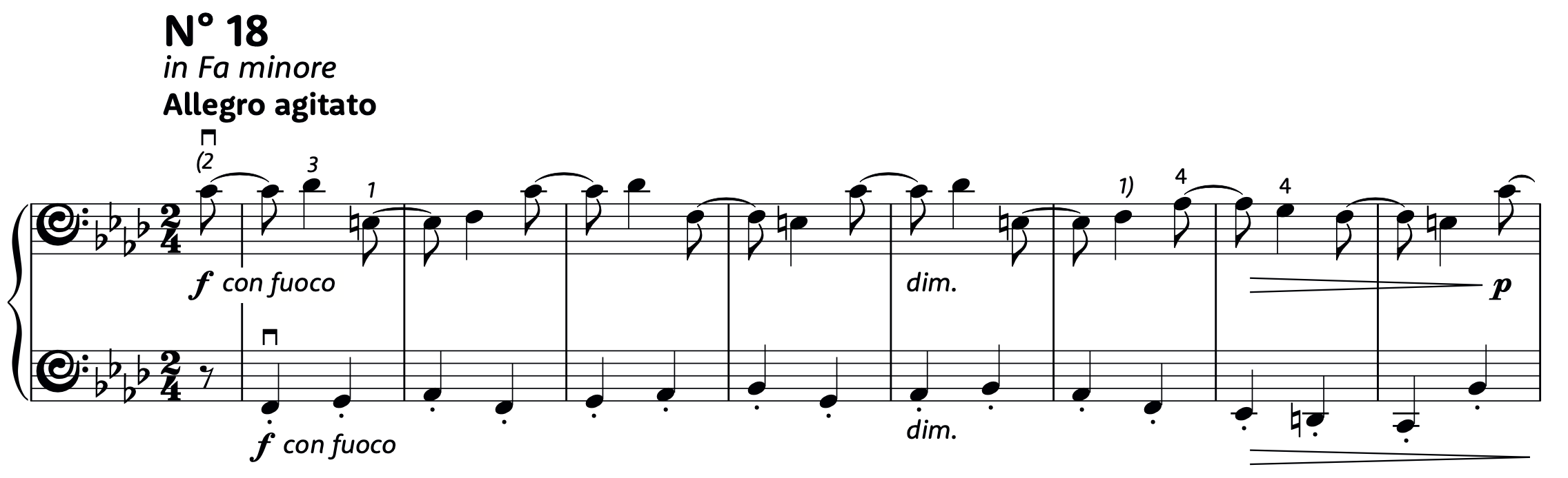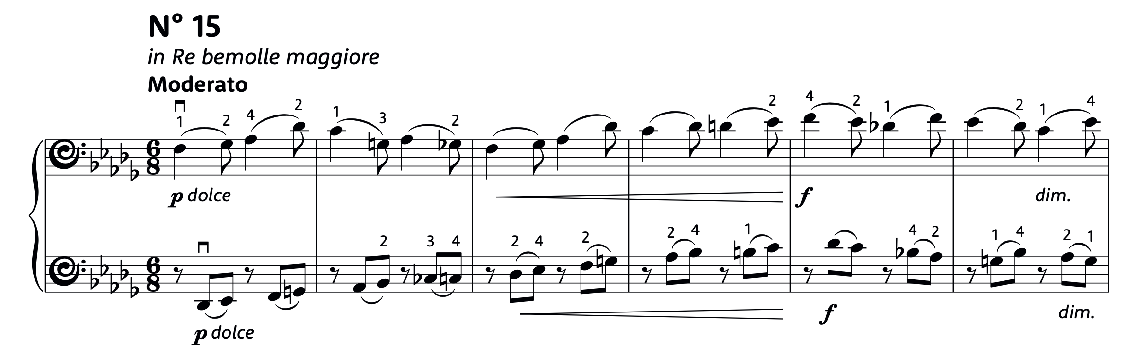 This Andante sostenuto, the first and only representative of the ternary compound metre 9/8, resumes the rounded binary form which had been interrupted by the previous fugue. The dialogue between the two instruments is simply exquisite, with the two registers crossing and parting ways like two dancing fishes in a clear mountain rivulet. Trusting that our students will have learnt the basic lesson of Part A: Tonic, Part B: Subdominant or Dominant, Dotzauer proposes once more a Romantic modulation to the third degree, starting Part B in C major. Its first period sees the first cello singing a proud melody, accompanied by a drum-like carpet of eight notes. Dialogue resumes in sub-part B: b, before allowing sub-part B: a to come back. Thus, the second part has a B: a-b-a structure, a ternary within a ternary! We carefully described the modulating procedure in No. 15, yet here Dotzauer simply lets the first cello linger on a lonely C, which is both the last note of Part B and the first note of Part A. This gives a honey-like melding effect that masterfully connects the two parts together.