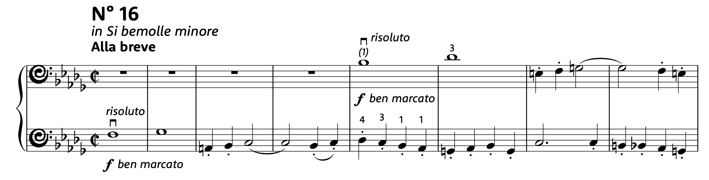 Curiously enough, this second fugue of the collection, marked once more Alla breve, is marked with a cut-C time signature instead of 2/2. They are basically the same thing, it is just interesting to see these two choices, whereas 4/4 is always written as C. Please also notice how these two fugues are written in two very complex keys: F-sharp and B-flat minor. The subject of this fugue is half as long as the previous one, clocking in at four bars, and the answer is at a perfect fourth above, instead of the perhaps canonical perfect fifth. These rules are obviously not set in stone, but it is intriguing to be aware of it. This fugue is shorter than the previous one, but in no way less beautiful or challenging. As it often occurs in contrapuntal works, this minor fugue ends with a major tonic chord, following what J. S. Bach said regarding contrapuntal compositions, I paraphrase: “being these works dedicated to God, they cannot end in a minor key”.