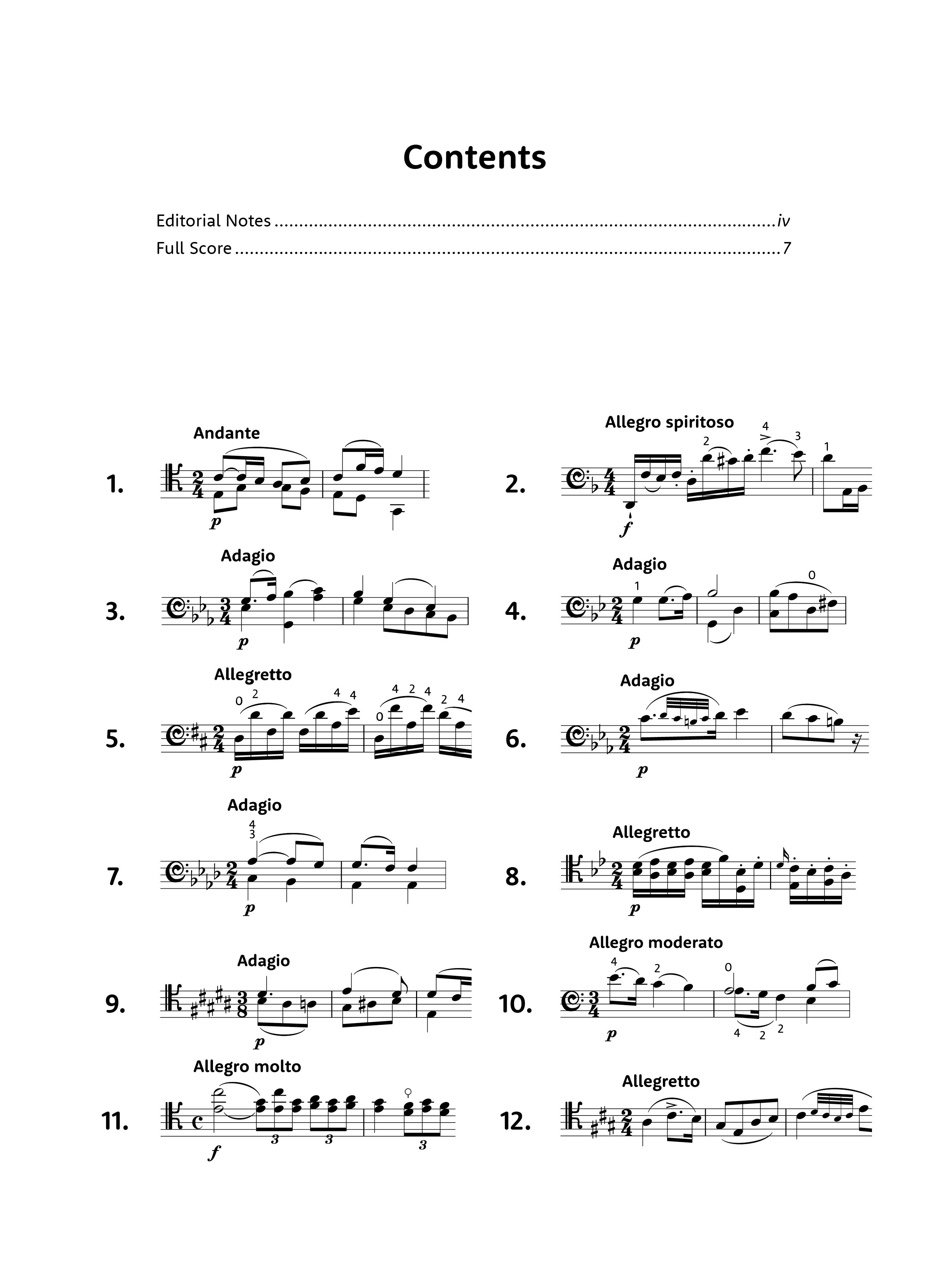 After completing the checkup on the notes and dynamics, I added the fingerings, noticing how Lindley used an X to mark the thumb position. Then I cleaned the design and built the book. They are lovely pieces, all but the last one made of two parts, akin to a prelude and dance, if you wish, and I suggest you try them out. Here is a picture of the table of contents, where you can see the degree of difficult you may expect from them.