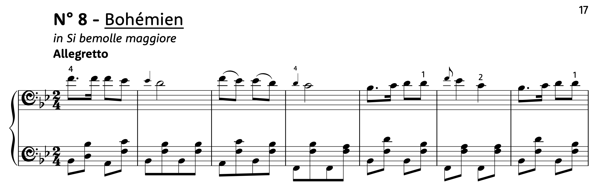 - Rounded binary form (A in the home key, B in a related key—subdominant, dominant, major relative—, A with “Da Capo al Fine” or slightly altered): nos. 1, 4, 8, 11