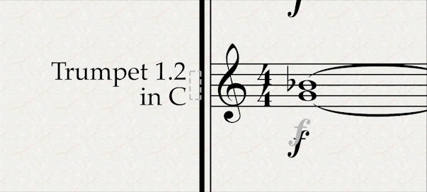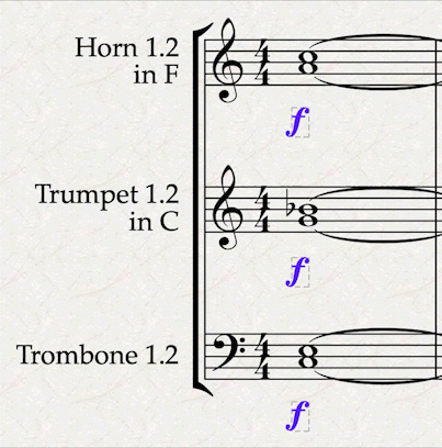 - Double click (or select and press Return) on the first “Horn in F” staff label (in my case it’s in F), and insert “1.2” between “Horn” and “in F”. Repeat the process for the next two horns, adding “1” and “2” respectively. Repeat the process for trumpets and trombones. Now we have, for each instrument, one stave for the condensed instruments, and one stave each for the single instruments.