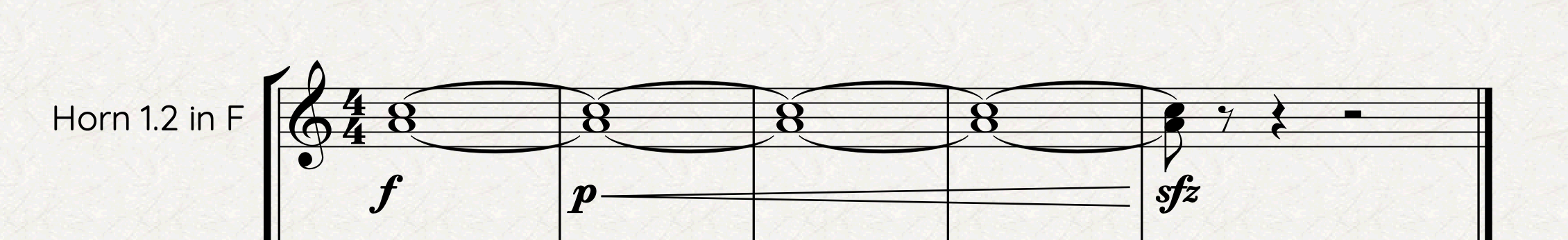 - Write some elementary music in the condensed staves, such as a very long tied dyad (a chord of two notes, also known as “harmonic interval”). In this case, with Transposing Score turned ON, I wrote A-C (sounding D-F) in the Horns, G-B flat in the Trumpets, and C-E in the Trombones. For rhythm, I have chosen four bars of tied whole notes and a final bar of a single eighth-note. You should get a result similar to this: