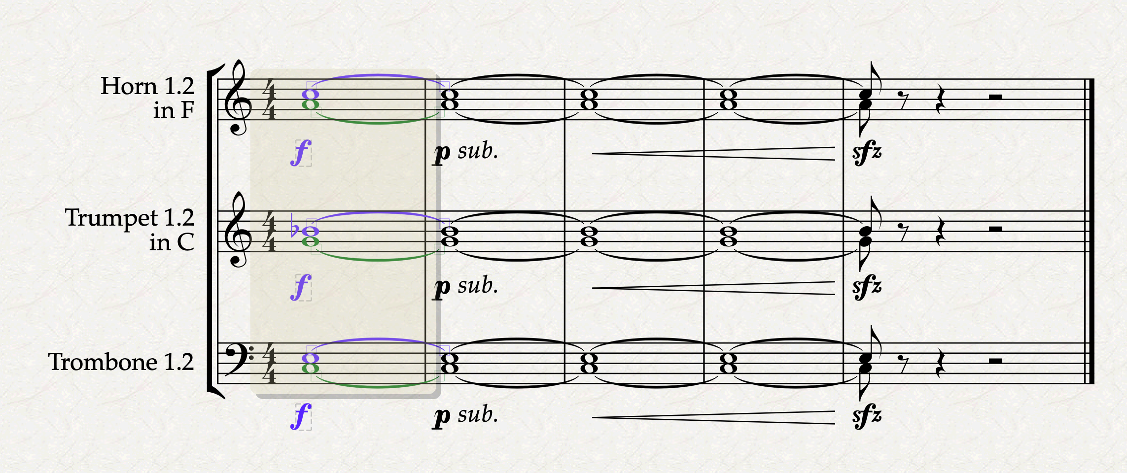 Here you can see that the two horns and the two trumpets have lost their dynamics. Those hidden superposed dynamics that we found in the “Trumpet 1.2” line are effectively their dynamics, which have been teleported away by the magic of Sibelius. You may see that Trombones didn’t lose their dynamics, and this is easy to explain why: when we selected all visible condensed staves, our passage selection included every stave between “Horn 1.2” and “Trombone 1.2”. Thus, “Trombone 1” and “Trombone 2” escaped the teleporting spell simply by being below its area of effect. Had we performed a system selection, they would have been involved too.