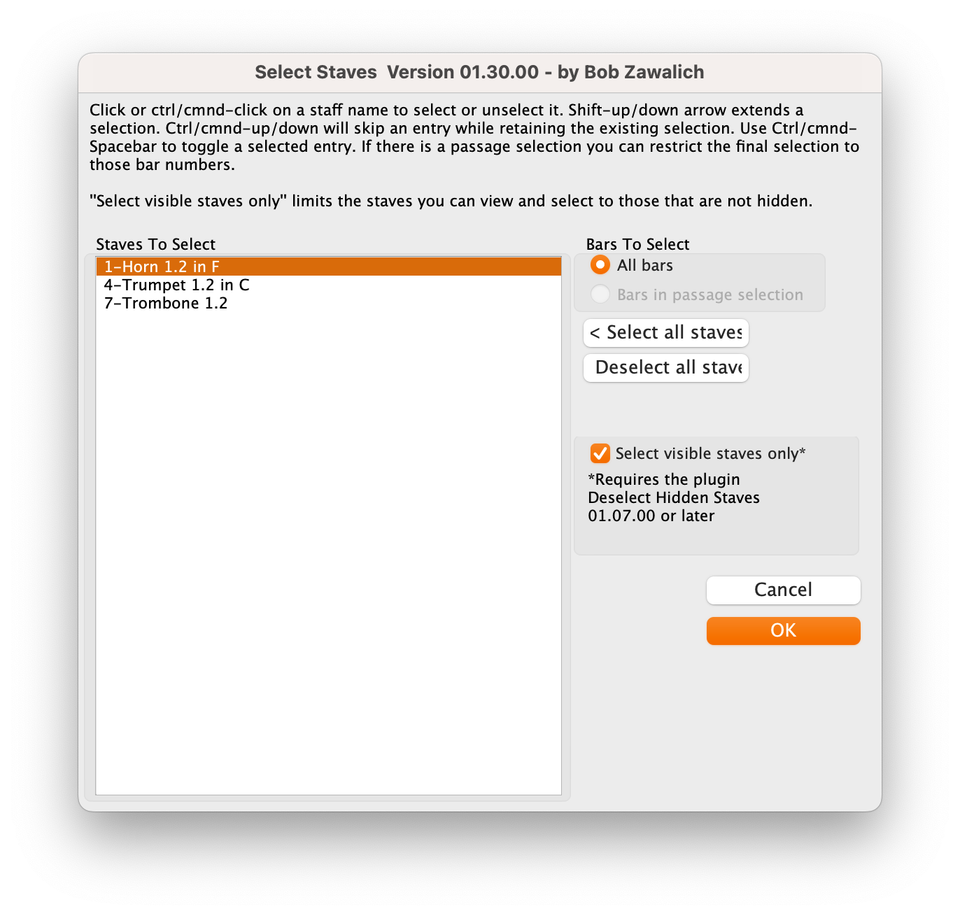 If you have more staves that need this treatment that you can easily select from a single screen, I suggest you use Bob Zawalich’s Select Staves plug-in3. Now, perform a horizontal passage selection on a single stave that contains the dynamics you would like to reposition. Run the Select Staves plug-in and you should see something like this: