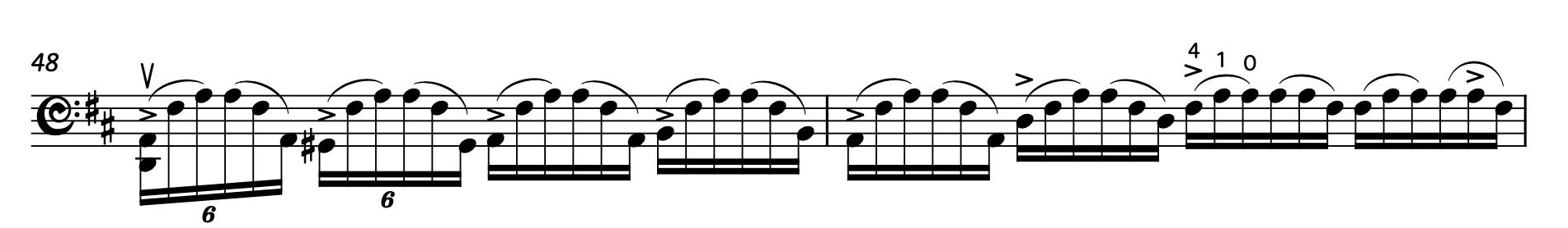 The next section, marked Allegro, is introduced by a short cadenza rich in chords and modulations. An arpeggio run on the Dominant of D major finally unveils the character that was hiding in the darkness: fast, furious, and jumping 16th-notes where the melody is accompanied by the constant drumming of the open A string. This is a Dominant pedal of sorts, akin to those we used to find in the ricercari, on whose form Bach Suites’ Preludes were based. This whole section is fiendishly difficult, all in double—and sometimes triple—stops, with several intervals of a tenth that could make it unplayable for smaller hands. Bow management is also terrifying, with the groups of four notes slurred by two and with staccato dots suggesting that all this should be played with a mix of spiccato and gettato. While practicing this, start slow, with a lot of relaxed weight on the string, and consider practicing the note changes in legato. Only when the left hand feels automatised, start accelerating but avoid voluntarily lifting the bow from the string, since this will make you lose control. The bow is innately elastic, as are the strings. With the right speed and weight, the bow will lift on its own, and you will be able to control the accentuations with precise, subtle movements of the wrist.