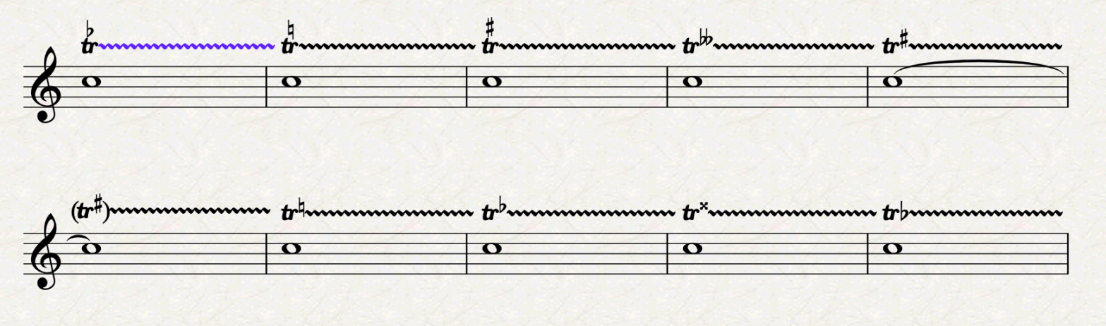 Press OK, then either close or keep creating all the other lines. For the “TRILL-beside-double sharp”, I suggest you change the “spaces right” to “-0.19” instead of “-0.06”, since the continuation line conflicts with the double sharp symbol. Here are the lines in action, look at how the last line of the system continues in the next system with the correct symbol.