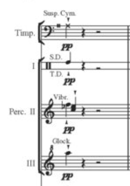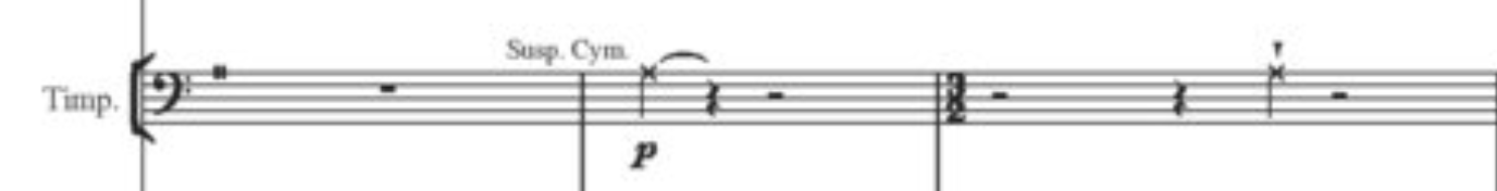 When dealing with Timpani, we saw how they are best given their separate stave instead of grouping them with other Percussion staves. It may happen, though, that the timpanist occasionally needs to help his fellow players. In this case, keep the staff label as “Timp.” and mark the new instrument with a player label directly above the entry.