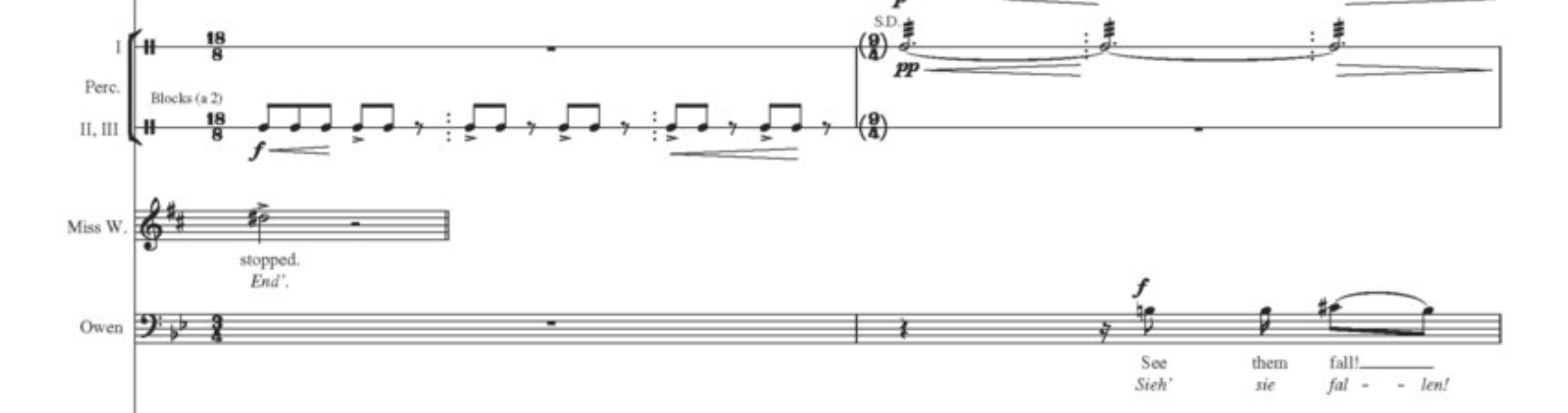When dealing with lyrics, use Regular typeface for the line in the main language and use the Italic weight for the line dedicated to translation (see Britten’s example above). It may very well happen, though, that the syllabication of the second language required a different rhythm. If this is the case, write the secondary rhythm in smaller notes, like this: