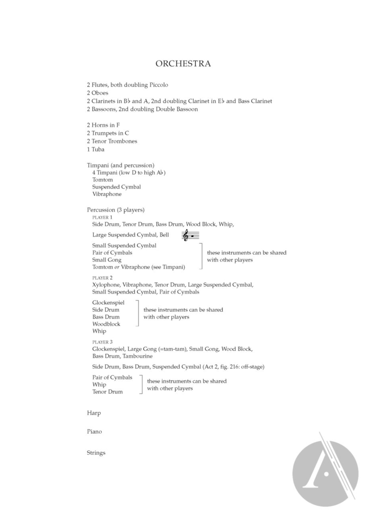 This page, usually on the verso side if it immediately precedes the beginning of the music, contains all the instrumentation info to help conductor and librarians. Here’s an example from Britten: