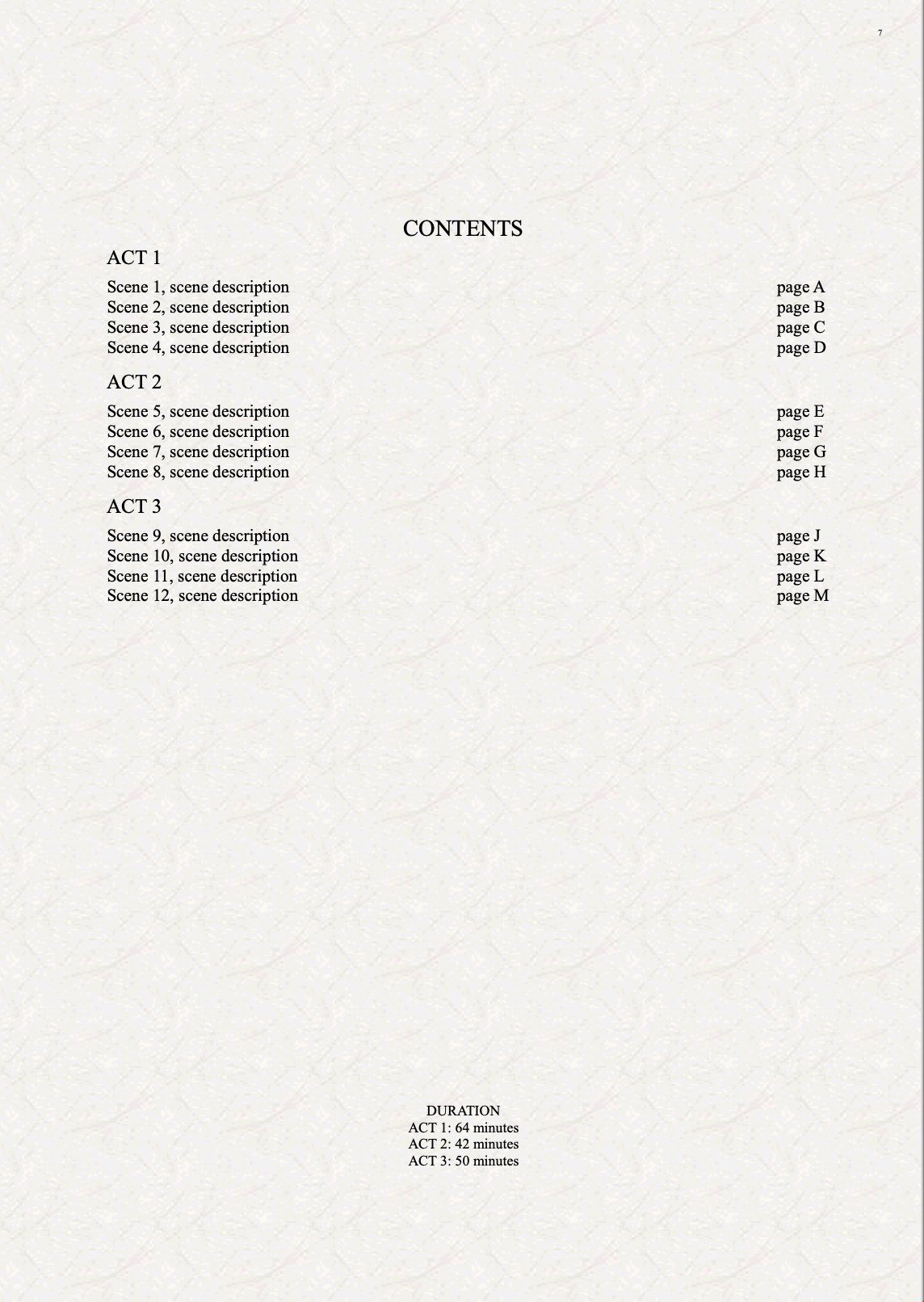 At the bottom of the page you can add the duration of the whole opera or of each act separately. Create a dedicated text style for that, as we did so far. The final result for this page should look something like this: