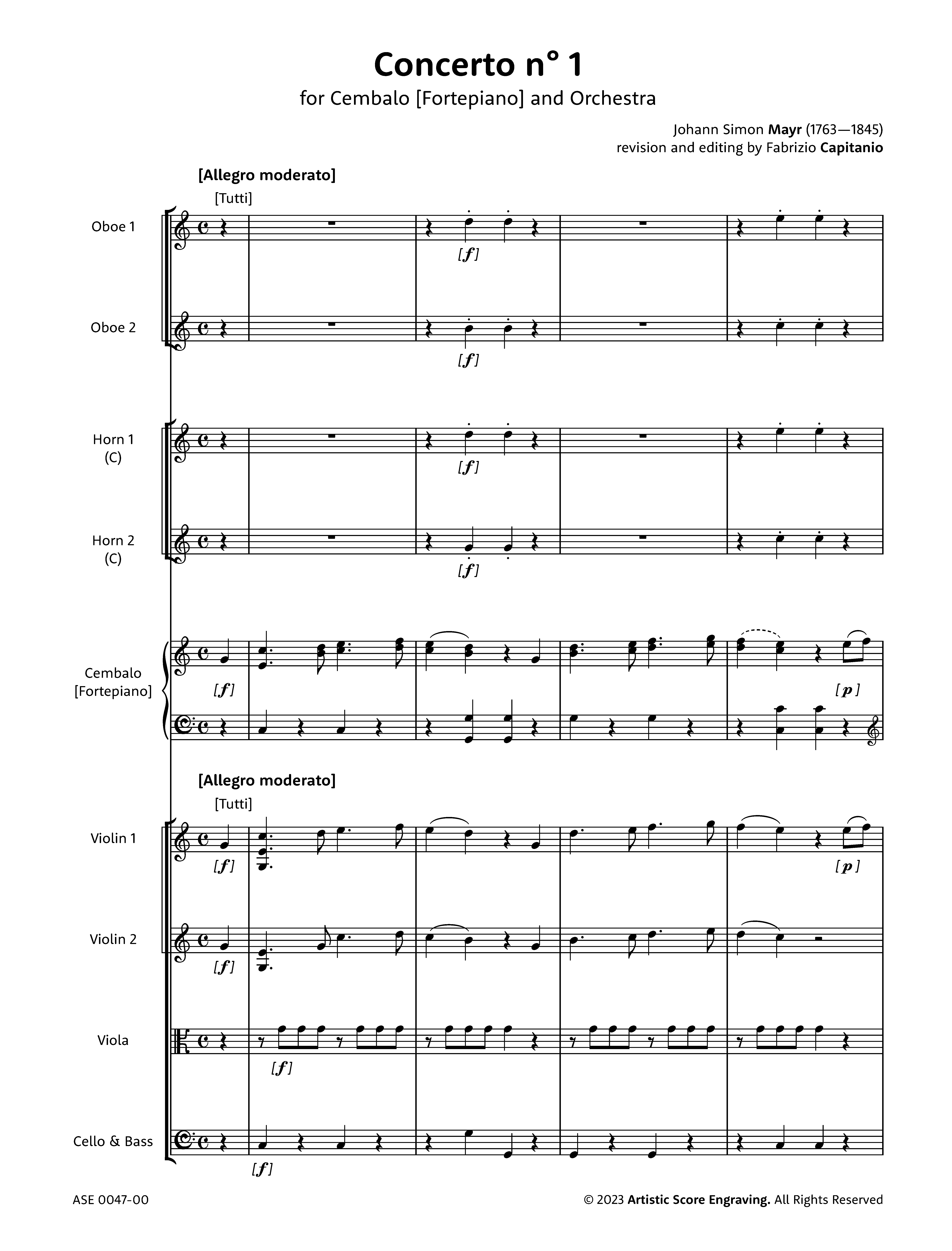 The three concertos for harpsichord (or forte-piano) and orchestra—two in C major and one in F major—, kept in autograph score in Bergamo at the Biblioteca Musicale Gaetano Donizetti and at the Museo Donizettiano, were written by Mayr with obvious pedagogical purposes. It is natural to think that they were intended for some student of the Lezioni Caritatevoli di Musica, of which he was the founder and director. Characterised by a kind of piano writing that is technically not very complex, combined with a melodisation and harmonisation of a purely classicist style, one can glimpse in Mozart and especially in Haydn, the models kept by the composer during its elaboration, which took place in an era in which the style of the two great Austrian masters had long been phased out.