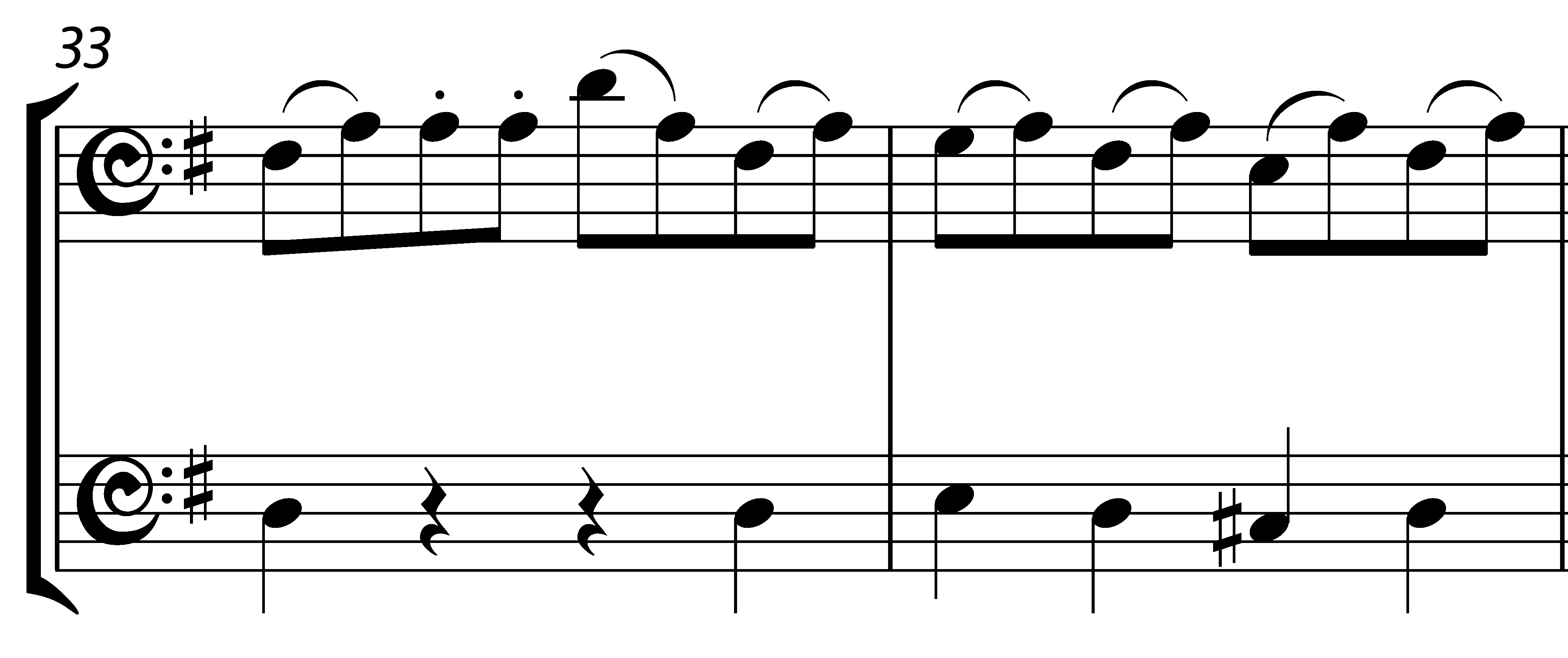 The first variation starts in b 17 with an apparently innocent decoration of the original melody, while the accompaniment modifies only the notes needed to make sense of the harmonic procedure. While both the theme and the first variations were in two parts, each with the repeat mark, what comes next is quite original, even though it could still be considered as a second variation. It is constructed in D minor, the relative minor key of the sonata’s home key, and contains the apex of the movement in the form of a 14-bar section where the obbligato cello shows its technical prowess over a dominant pedal enriched by lowered submediants.