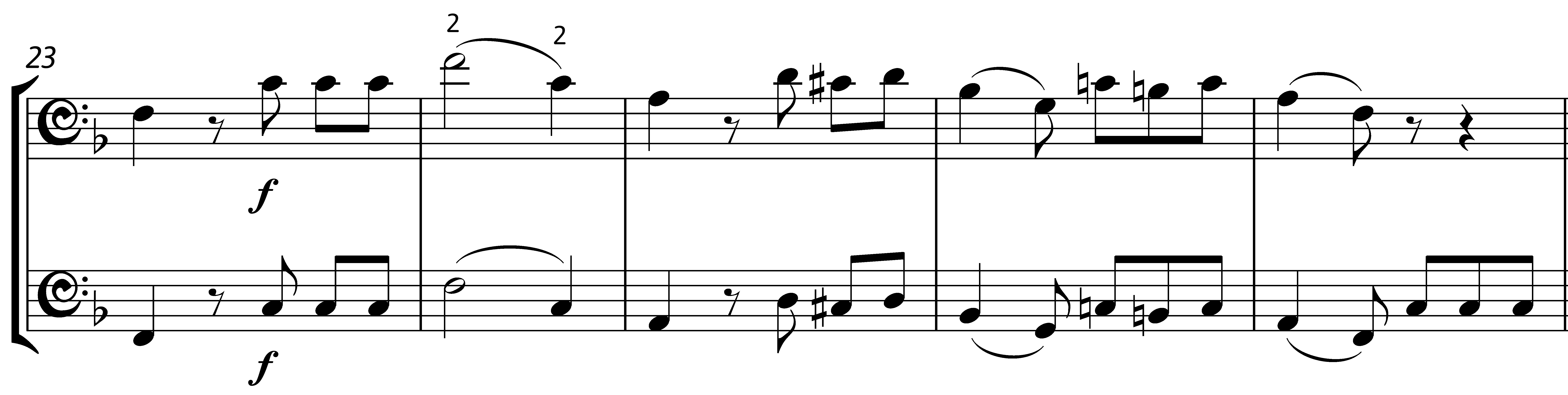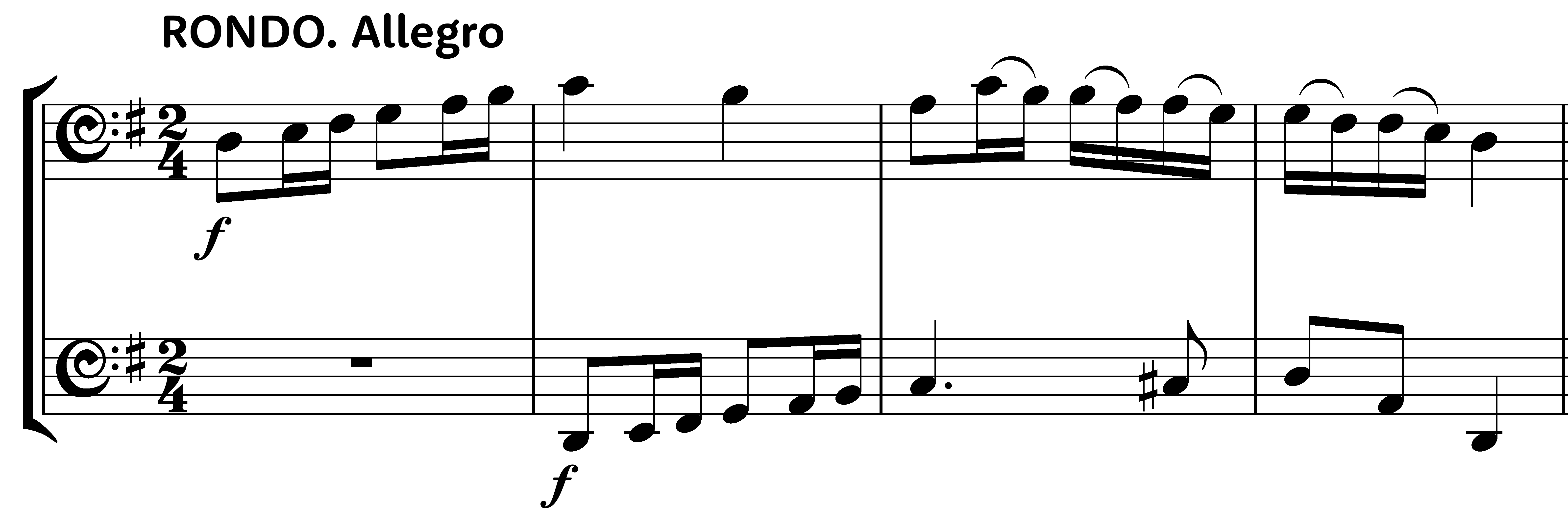 Exactly as with the previous finales, two 8-bar sections form the opening Part A, both of them with repeats. The Part B that follows uses the three-quaver figures passing through the two instruments as a propeller for a tonality journey that touches D minor, A minor, G major, and finally C major. A new idea emerges just before the return of the opening theme, with both parts offering something unique: