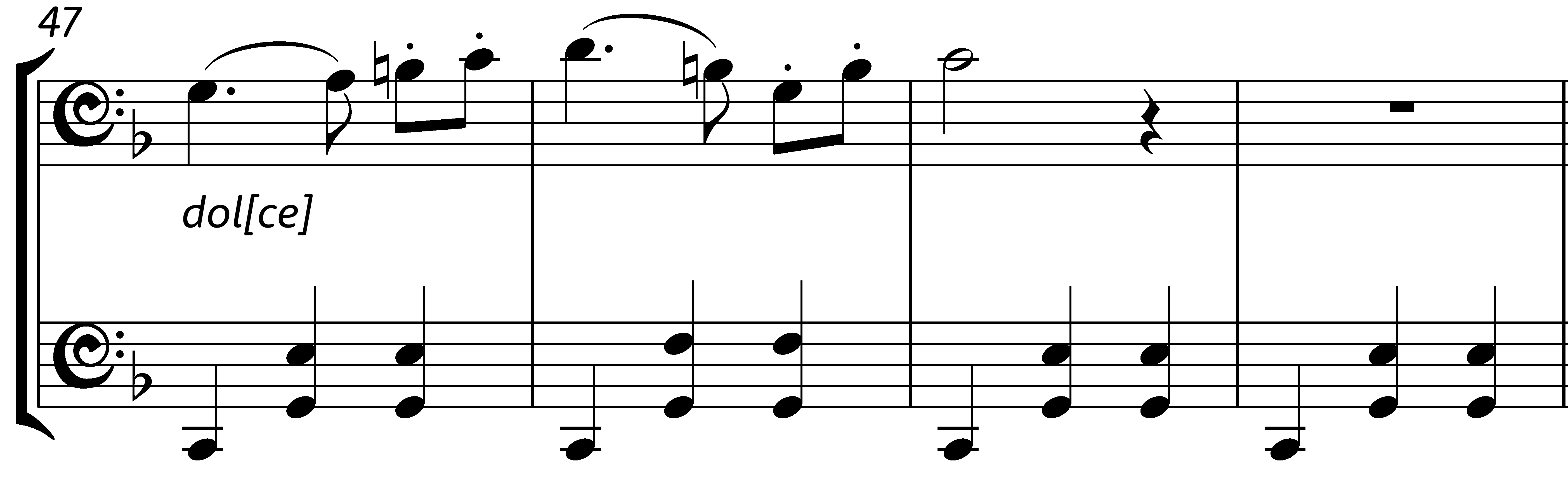 The second movement, Andante, chooses a melody that requires a singing line also in the basso to feel complete. The rhythmical structure is in 6/8, with a quaver upbeat.