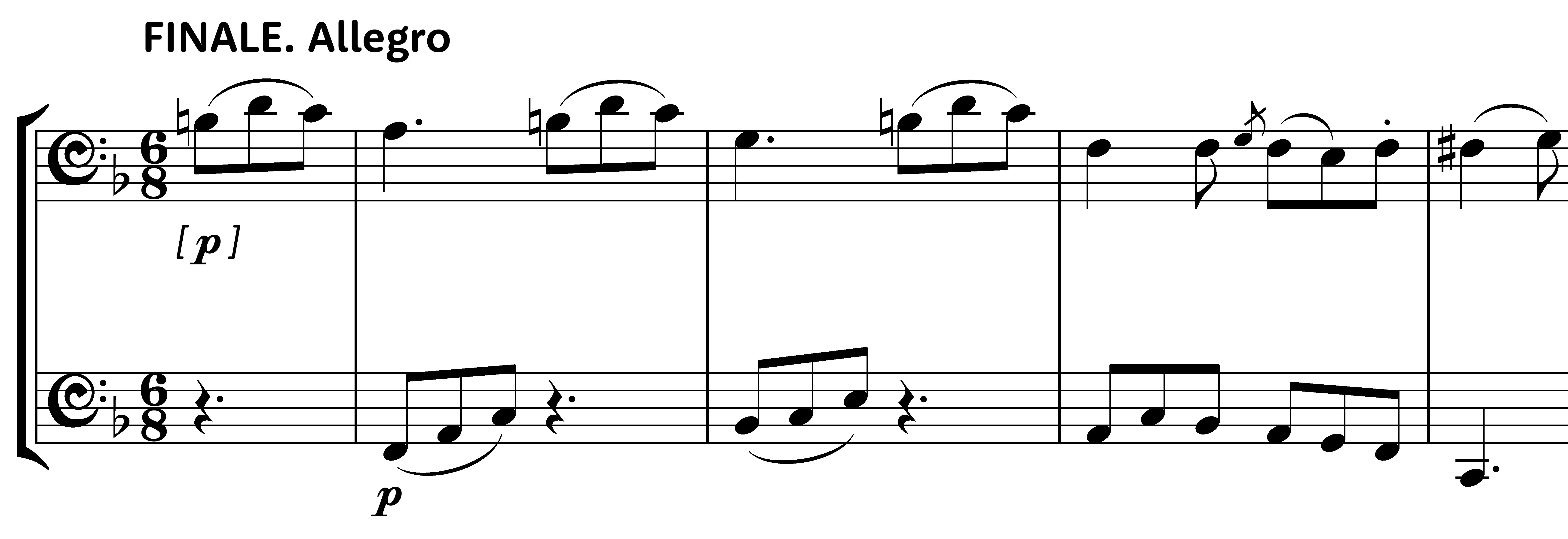 The third movement, labelled FINALE. Allegro, is once more a Rondò, is back in the home key of F major, and is in compound binary time (6/8) starting, though, with half a bar of upbeat. It is possibly the weakest one melodically, but it compensates with the ingenuity of the musical construction.