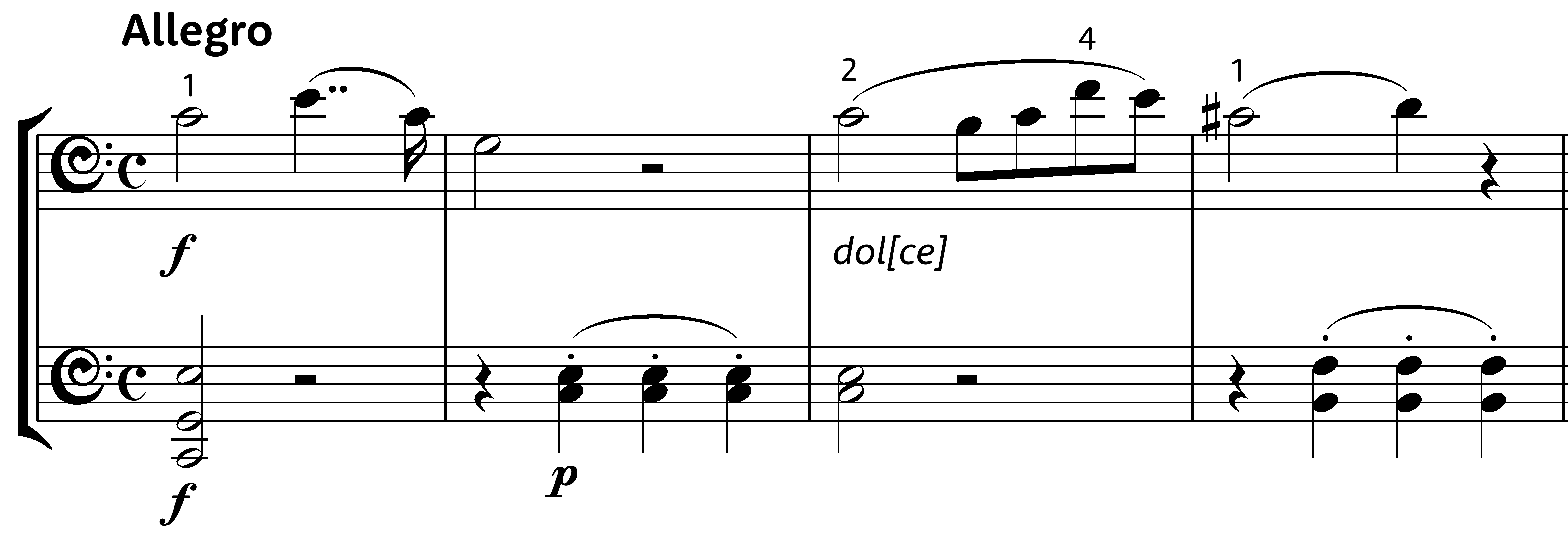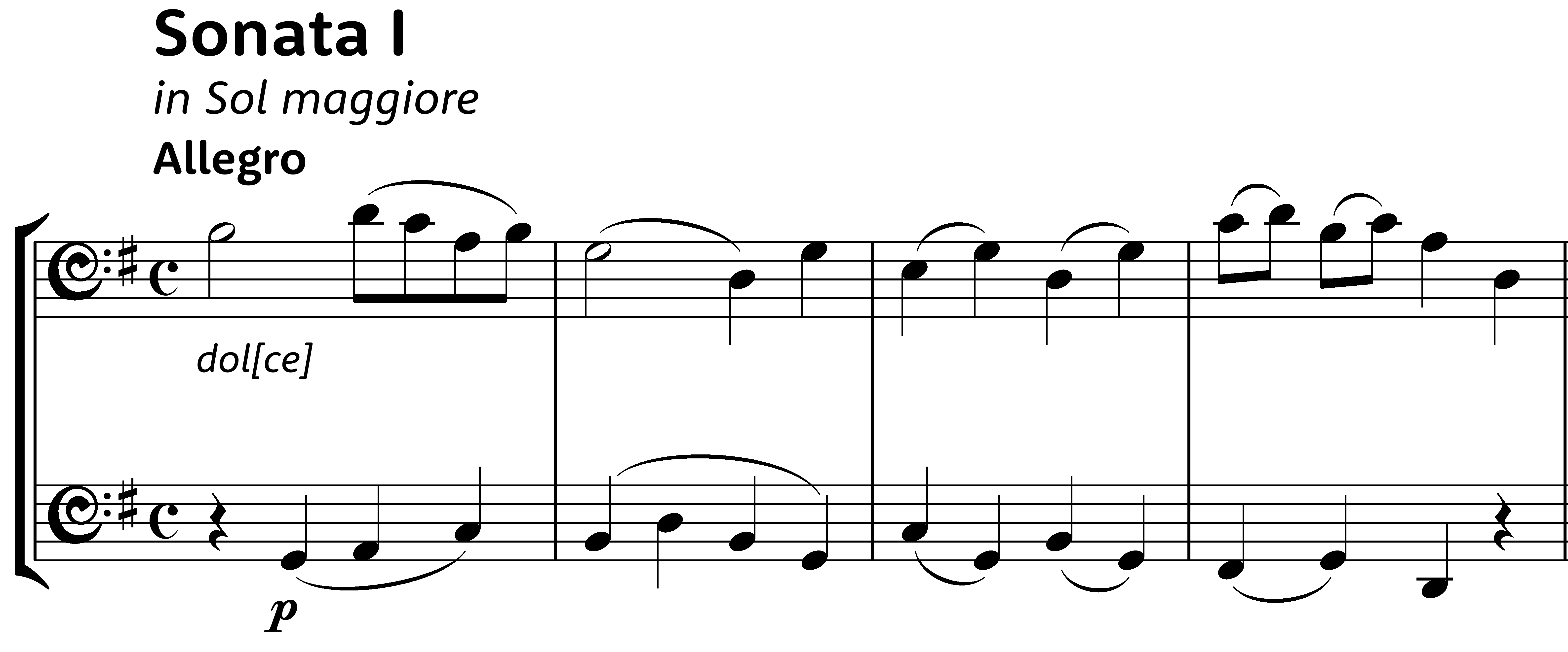 The first movement, Allegro, opens with a singing melody accompanied by a regular counterpoint in the basso line.