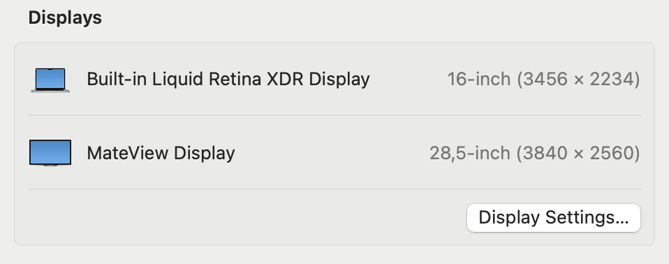 Below that, there’s a section dedicated to Displays. If you have only the Built-in display, it will show only that, followed by its size and resolution. When I connect my external display, it looks like this: