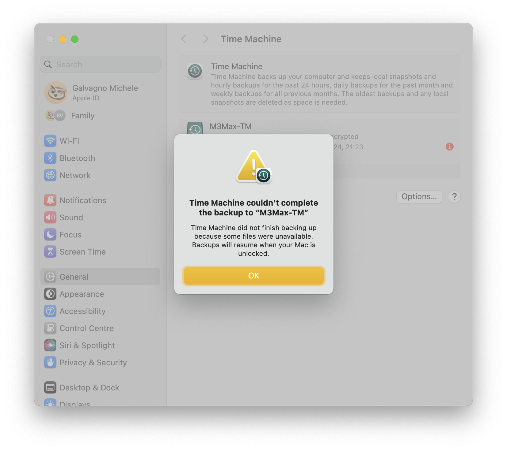 I didn’t perform a single backup until I finished configuring this new Mac, also because I didn’t have a spare drive to use. Having a 2 TB internal drive needs at least an equivalent drive for the backup, and it took me a while to get my hands on one. I then set it up with the Encrypted version and left the “Back up on battery power” option switched ON. With such a gorgeous battery and energy management of this Apple Silicon beast, it sounded good enough. There is only one problem: you cannot prevent your Mac from going to sleep when it is running on battery and its screen is turning off to save energy. Still don’t see the issue? I encourage you to try this out yourself, since macOS is advanced enough to avoid any harm coming to the backup, but let’s say you connected your backup disk and Time Machine started to perform its work. You walked away from the Mac, the display went off, and the Mac went to sleep. Upon waking it up, you would see something like this: