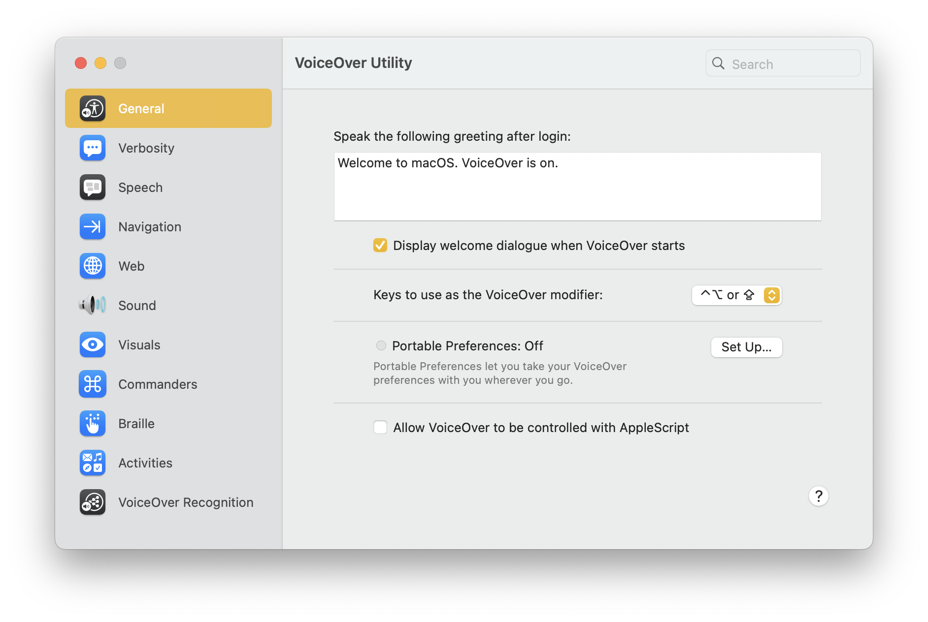 The switch at the top activates VoiceOver, and one can toggle it ON and OFF by holding down the Command key and quickly pressing the Touch ID button three times. For Macs without a Touch ID, it is suggested that Accessibility Shortcuts be used instead. To access them, press Fn-Option-Command-F5: