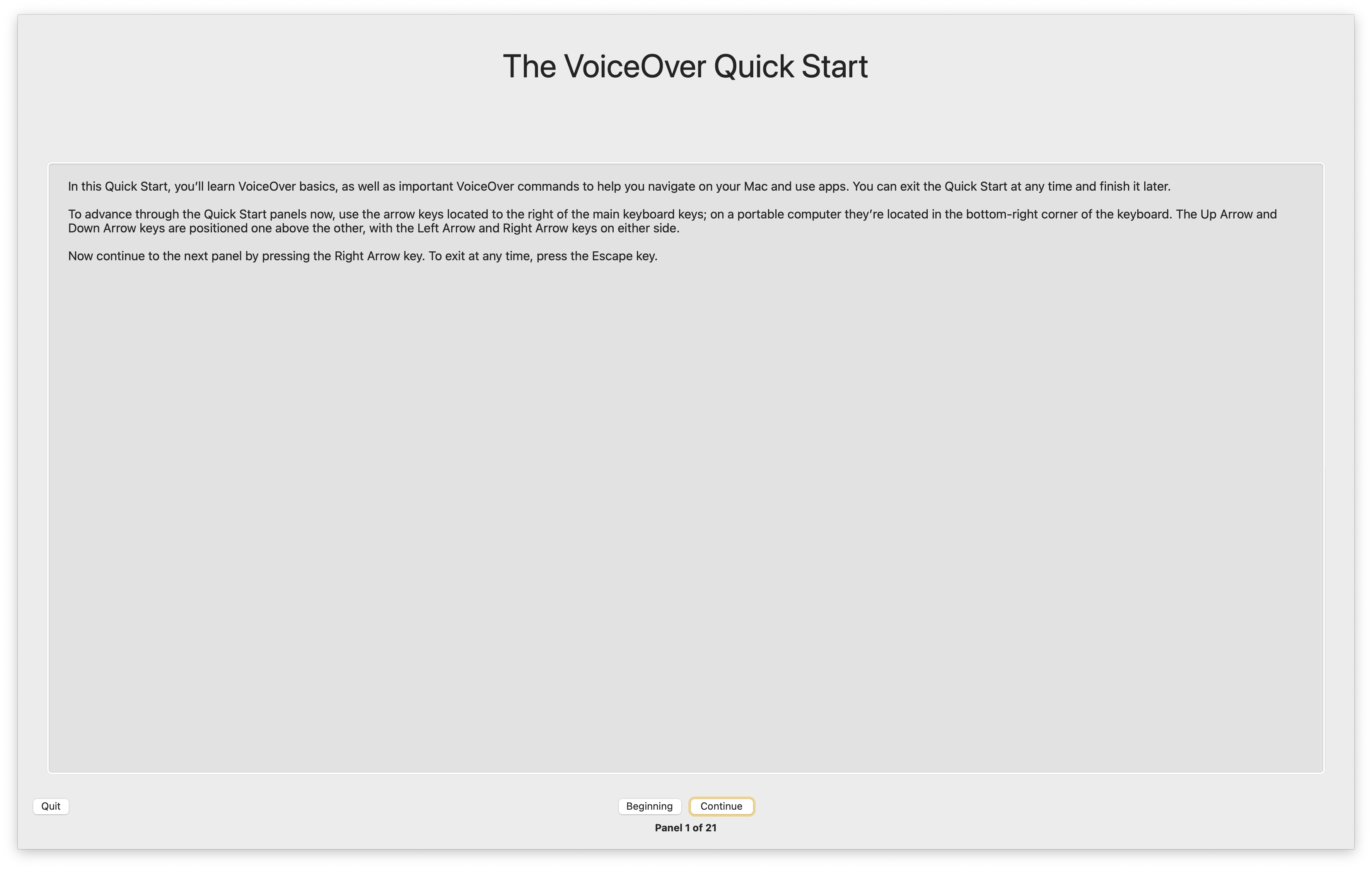 The goal of VoiceOver is that of providing spoken and Brailled (this is new to me!) descriptions of what is happening on your computer’s screen. It then gives the user options to control the computer through the keyboard.
