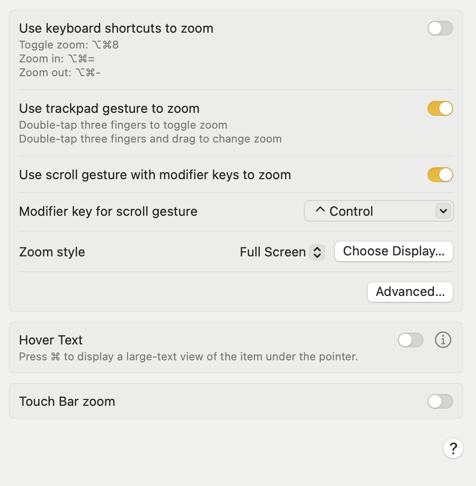 When I first configured this Mac, I had unchecked this option in favour of the one just below, Use scroll gesture with modifier keys to zoom, but while I am writing this, the first one feels so much more natural that it has now become a no-brainer choice to me. If you still want to go for the scroll gesture with modifier key, just use the dropdown menu next to Modifier key for scroll gesture to choose your key.
