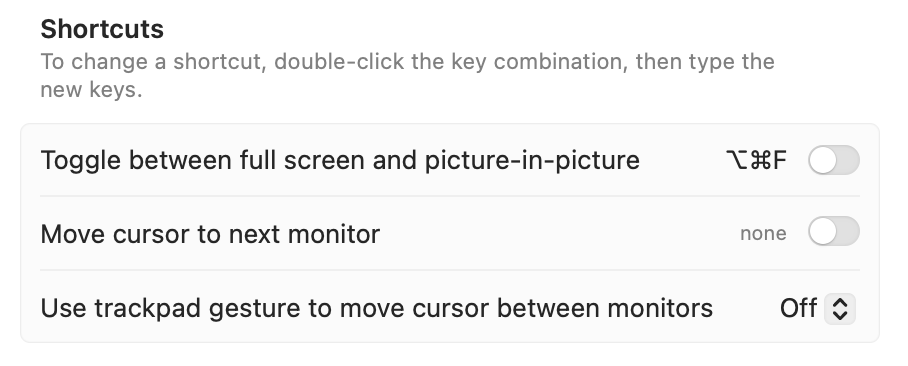 The Controls section contains fine-tuning settings that allow you to use keyboard shortcuts to adjust the zoom window when in split screen or picture-in-picture mode (default OFF).