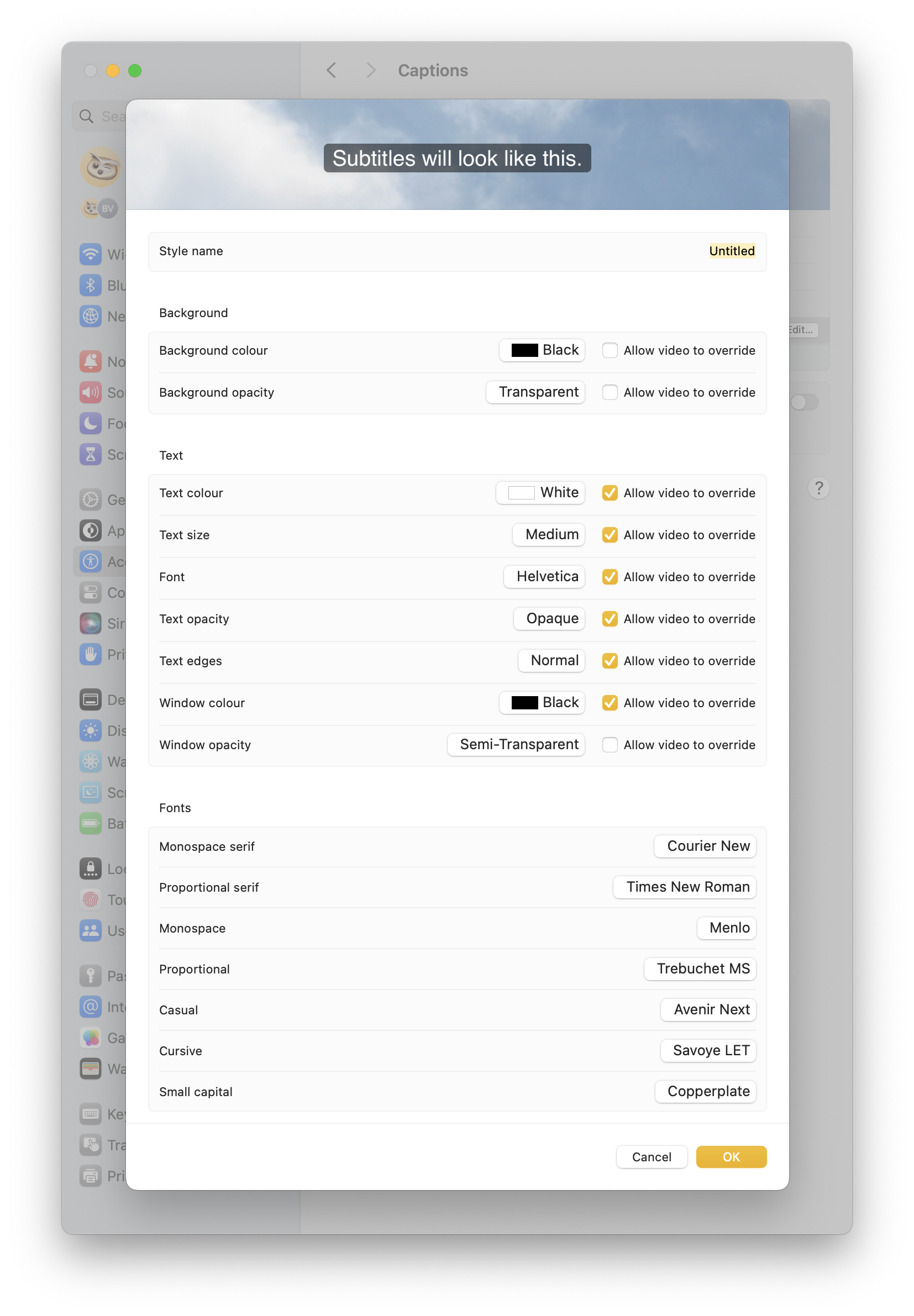 The top table allows you to decide between four different presets for captions in videos. If you press the + button, you get to create your own preset, with just a few options to choose from: