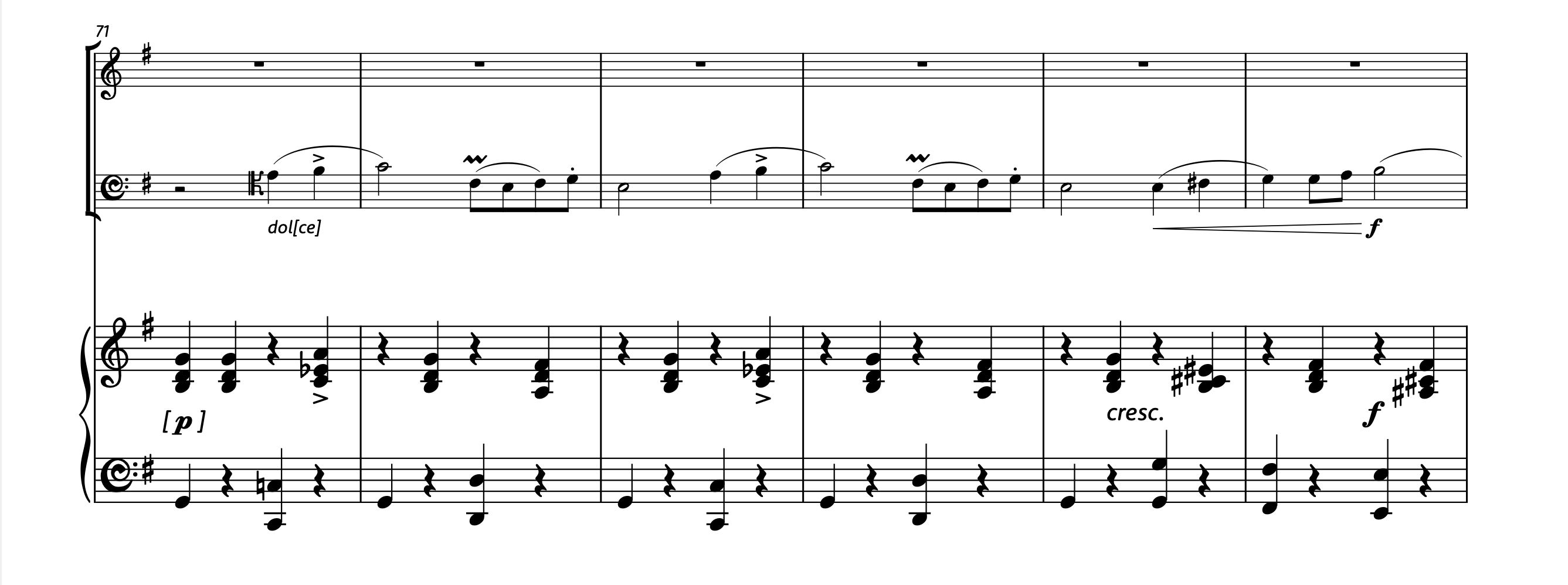 The whole phrase ends with a perfect cadence in B minor, but the violin doesn’t buy it, and insists in repeating the unaltered first part of the theme. The cello immediately engages in a contrapuntal battle, and the violin is obliged to change course to stay in G major. The piano is given its chance to express its perspective on this theme, proposing several modulating ideas while eventually coming back home with an ascending and descending scale in octaves where the triplet element tentatively peeps round the door.