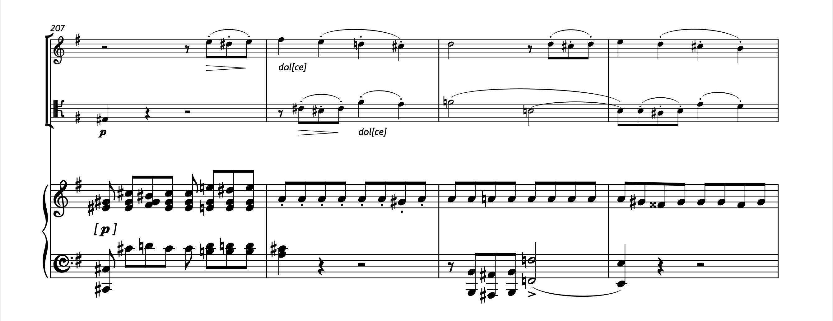 This whole period is repeated twice, with the strings engaging in complex chordal polyphony and the piano experimenting with different triplet configurations within the same harmonic path, eventually leading us towards E major. Contrary motion arpeggios in triplets in the piano, accompanied by ever more serrated syncopated chords in the strings, and followed by a chromatic descent, open the way towards the Development section, which begins with the main theme in the new major key. The melody is sung by the violin, but the cello immediately answers half-a-bar later with a stricter counterpoint, closely followed by the piano. The three instruments dance and swirl with and around each other, proposing, answering, falling back, pushing forward, until the theme of the bridge suddenly erupts in E minor.