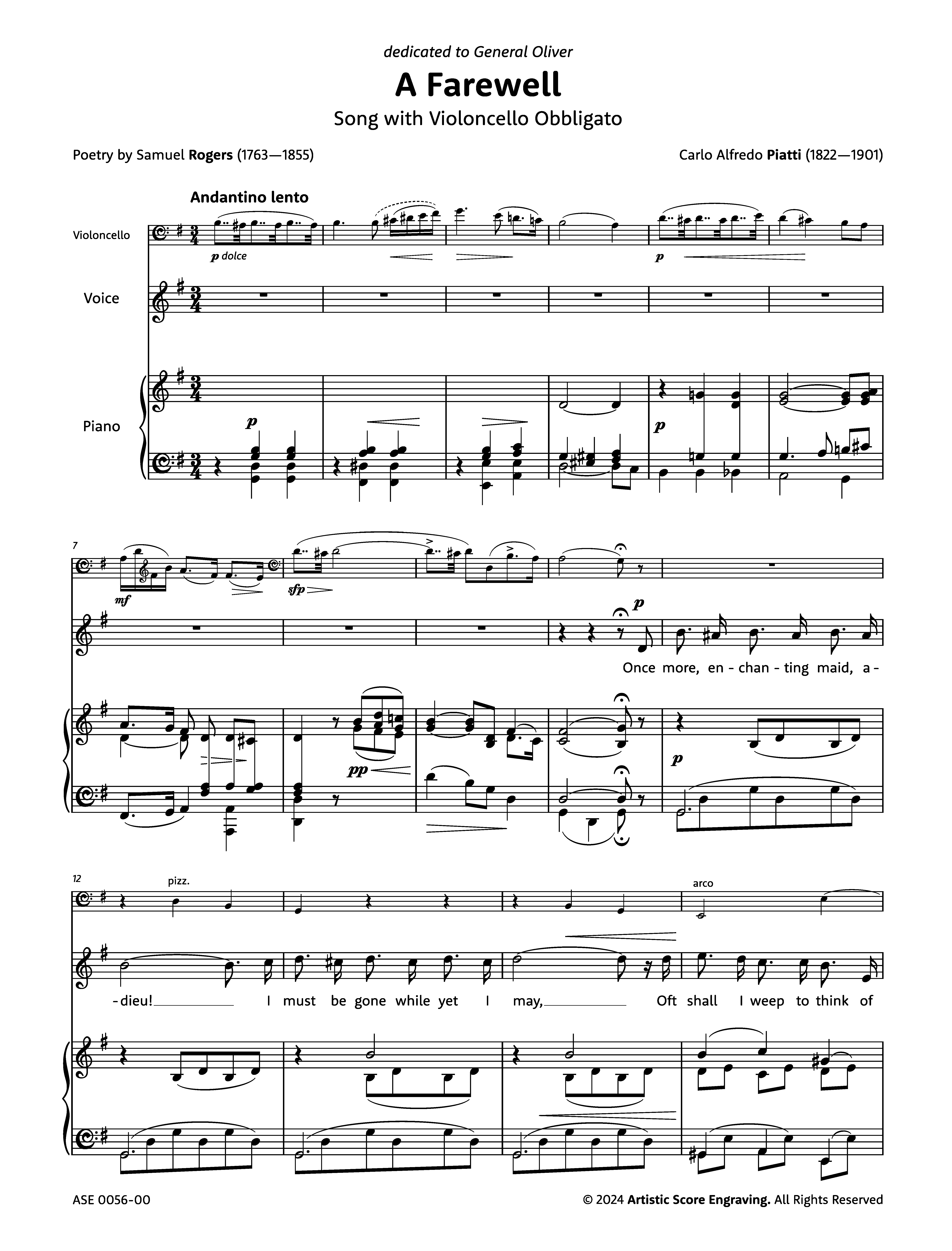 The second and third editions are based on the same text, A Farewell by Samuel Rogers (a British poet), but the similarities end here. Around 1863, fifteen years after coming to live in London, Piatti wrote two versions of this song and, curiously, the first one to be written was the one with additional cello. The following year, a version for just voice and piano would be published.