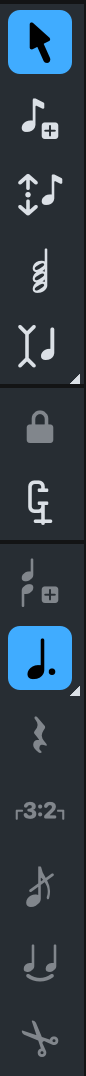 Per inserire note puntate, dovete prima selezionare una durata, quindi fare clic sul pulsante della nota puntata nel pannello Note a sinistra. Potete anche usare il tasto “punto” (.) sulla tastiera per attivarlo.