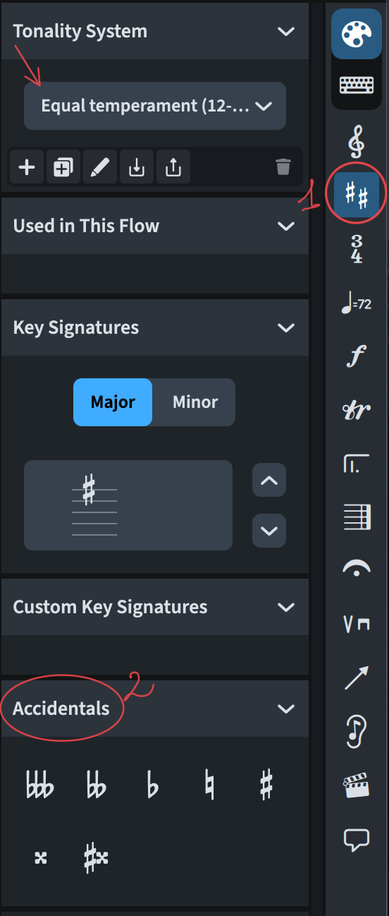 Con una tastiera, tutto funziona allo stesso modo della versione desktop. Senza, dovrete fare affidamento sul pannello Tonalità nella tavolozza del lato destro per tutto ciò che riguarda le armature di chiave e le alterazioni. Si noti che, in Dorico per iPad, non è possibile creare sistemi di tonalità diversi da quello standard. Per l’enarmonia, utilizzate i pulsanti nel pannello della tastiera del pianoforte (pulsante dell’angolo in basso a sinistra, quindi il secondo pulsante da sinistra).