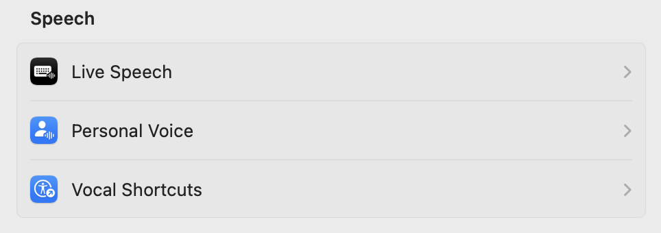 The Speech section is made up of three pages: Live Speech, Personal Voice, and Vocal Shortcuts.