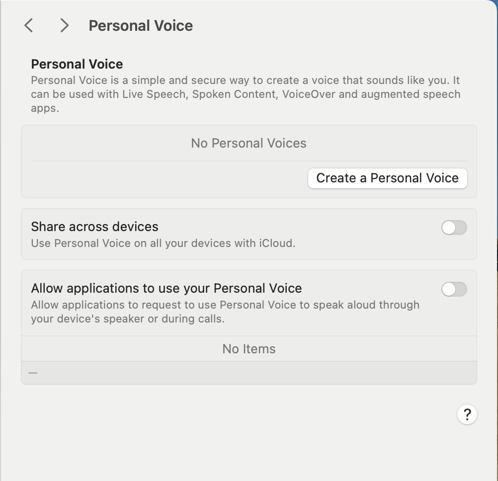 Personal Voice is a straightforward and bulletproof way to synthesise a voice that replicates your own so that, then, you can use it in Live Speech (see above), in any Spoken Content on your Mac, for VoiceOver, and much more. Third-party apps that support this need to be of the Augmentative and Alternative Communication (AAC) kind. We are allowed to use Personal Voice only to create a voice that sounds like us on our device, using our voice and for our personal, non-commercial use. This is crucial in an age when deep-faking is ever more abundant.
