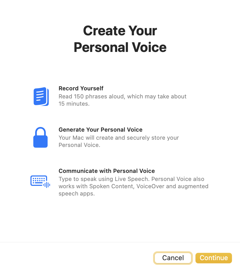 Pressing the Create a Personal Voice button will prompt biometric user authentication (or through your login password) to get started. The next screen will explain what is going on: