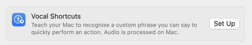 This feature allows you to train your Mac to recognise a custom phrase you can then say to perform an action quickly. macOS is careful to specify that any audio used is processed on-device.